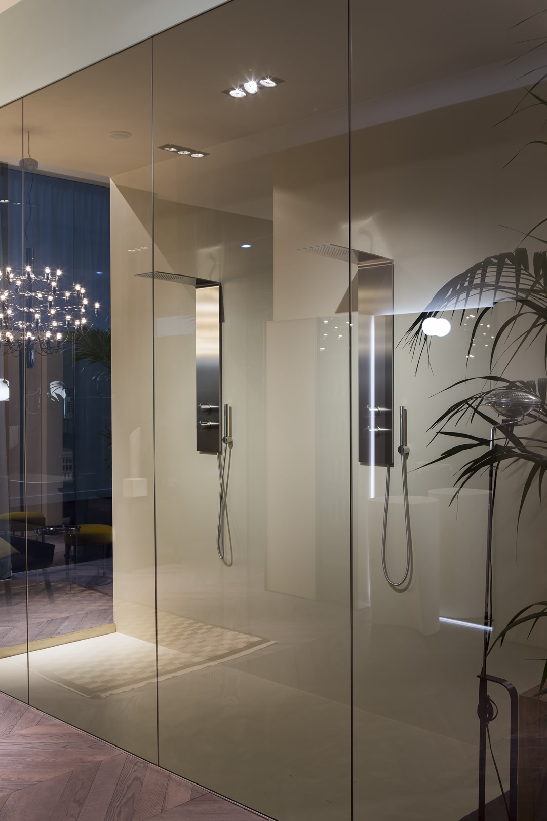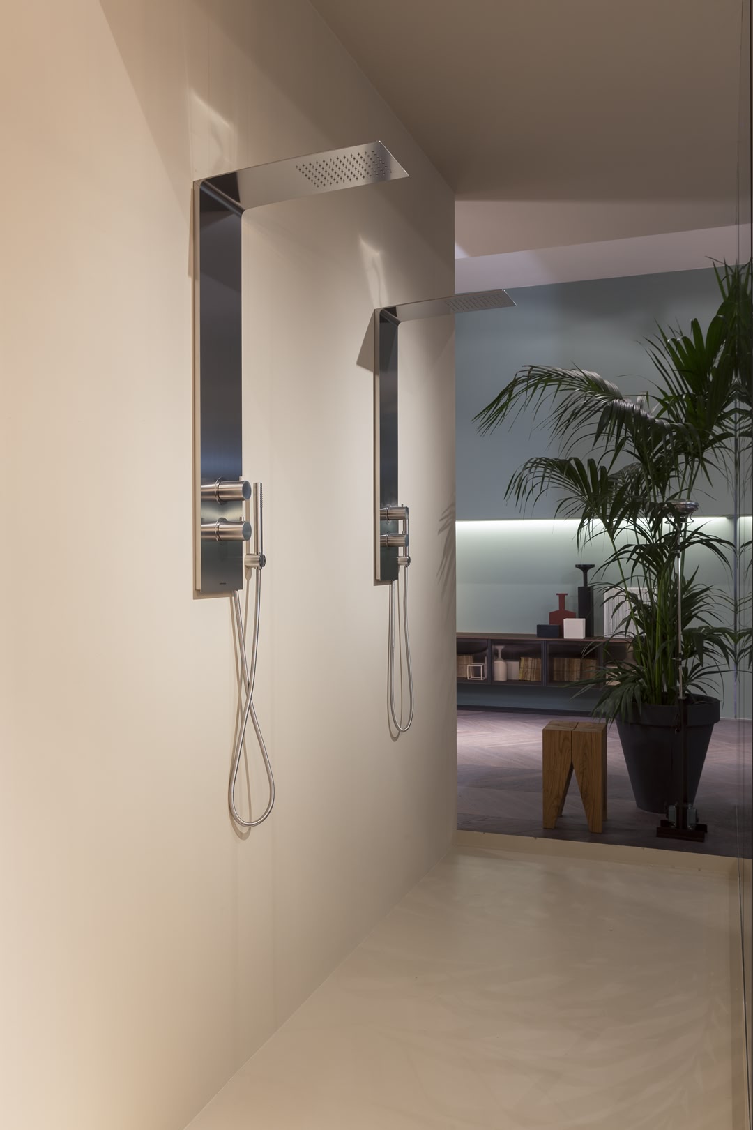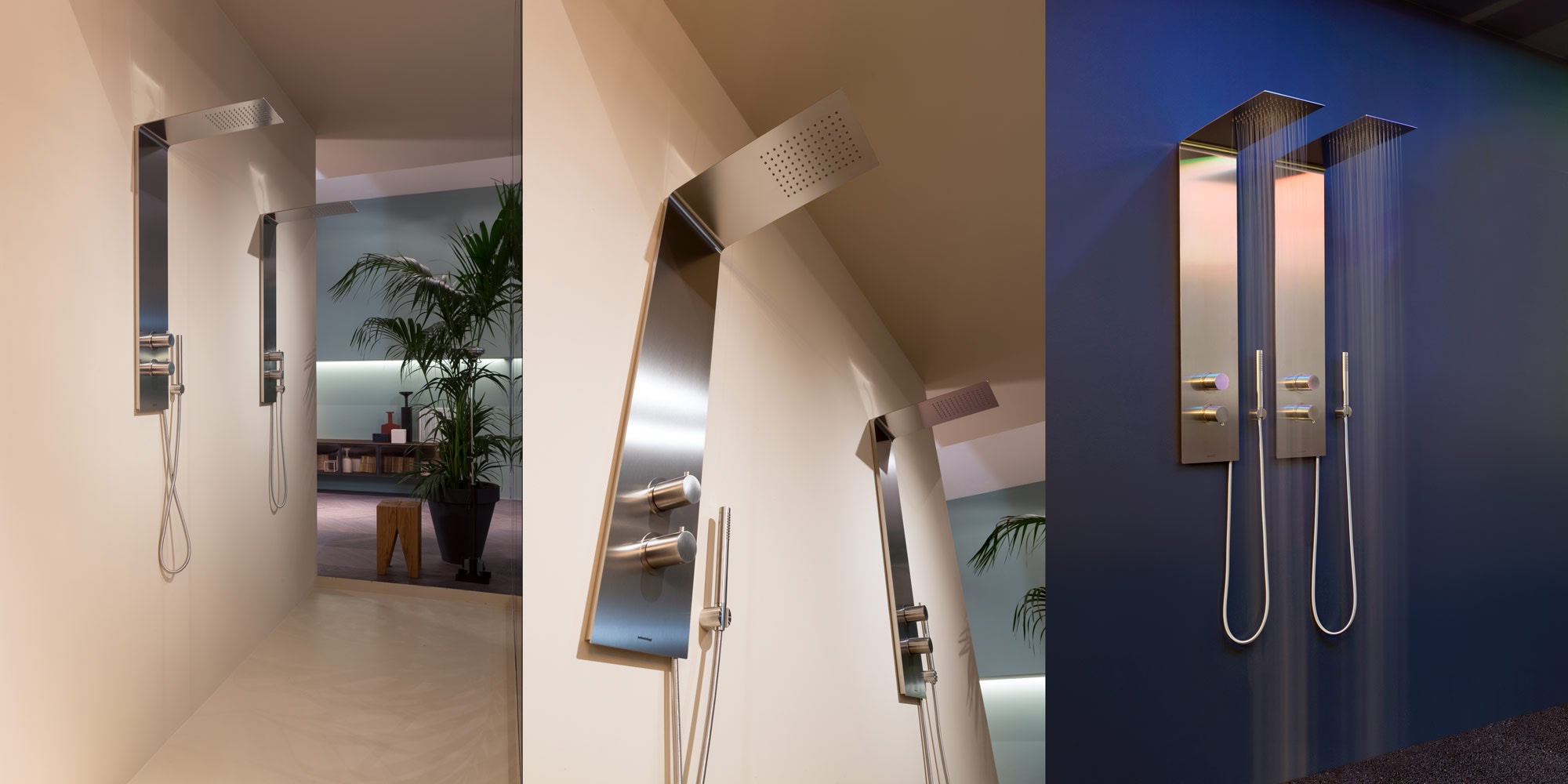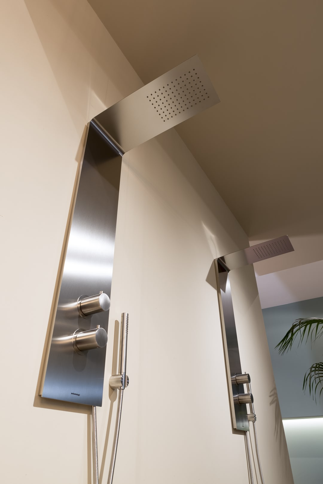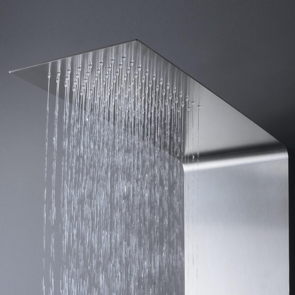 A continuous element, a pure and essential steel plate with net precise lines that seamlessly combine shower column and head.