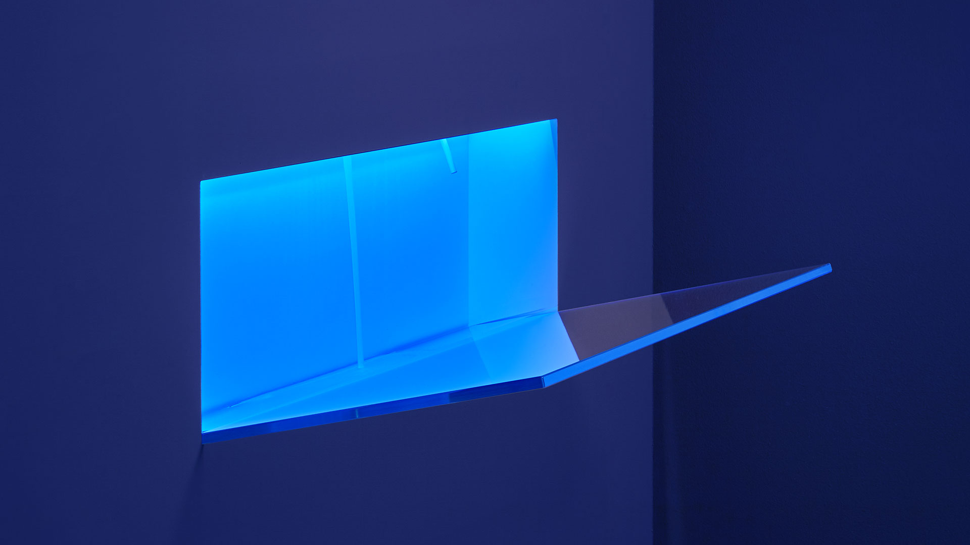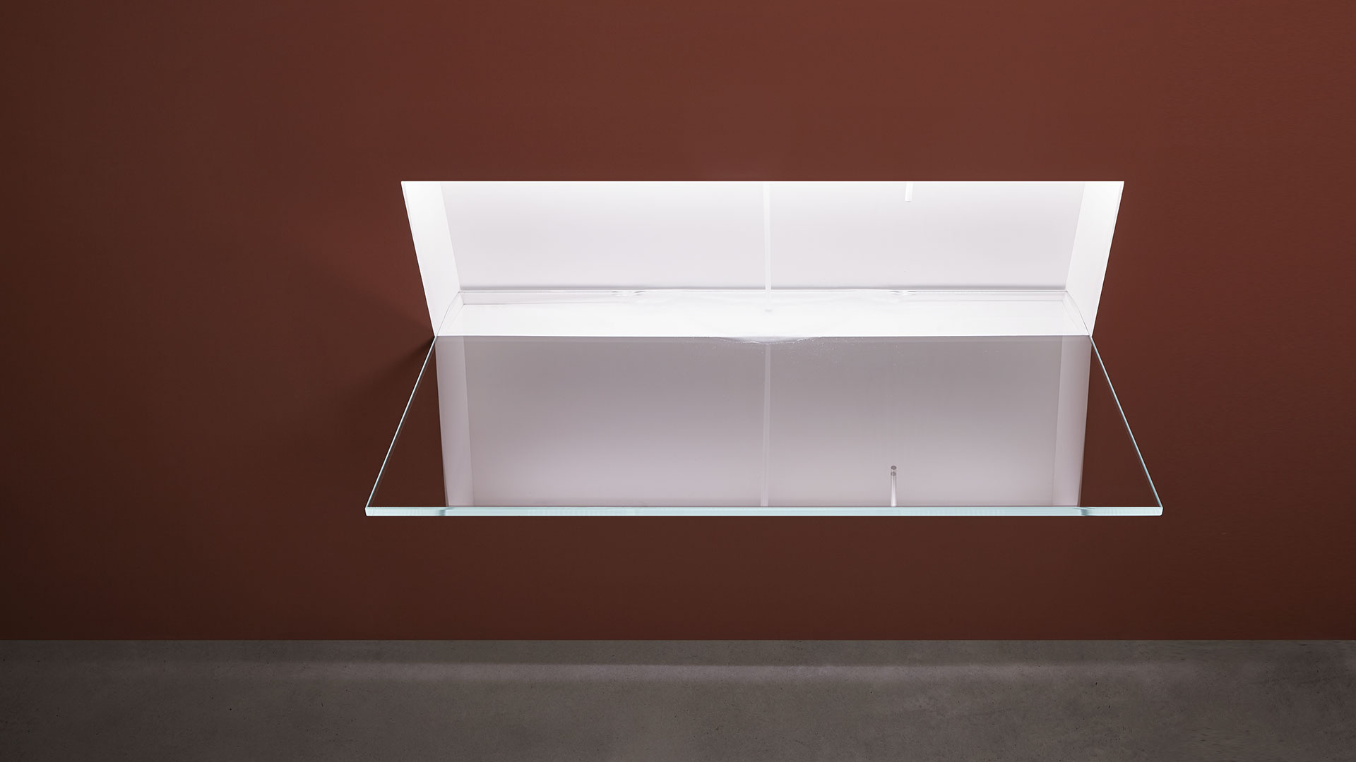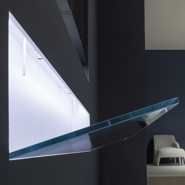 The only thing visible is an inclined surface of glass, available also in Moodlight or marble, that inserts into the wall on the bottom of the sink. A completely smooth surface ready to receive water designing a wave on the artificial shoreline and mysteriously flows from invisible sources adjustable from a joystick.