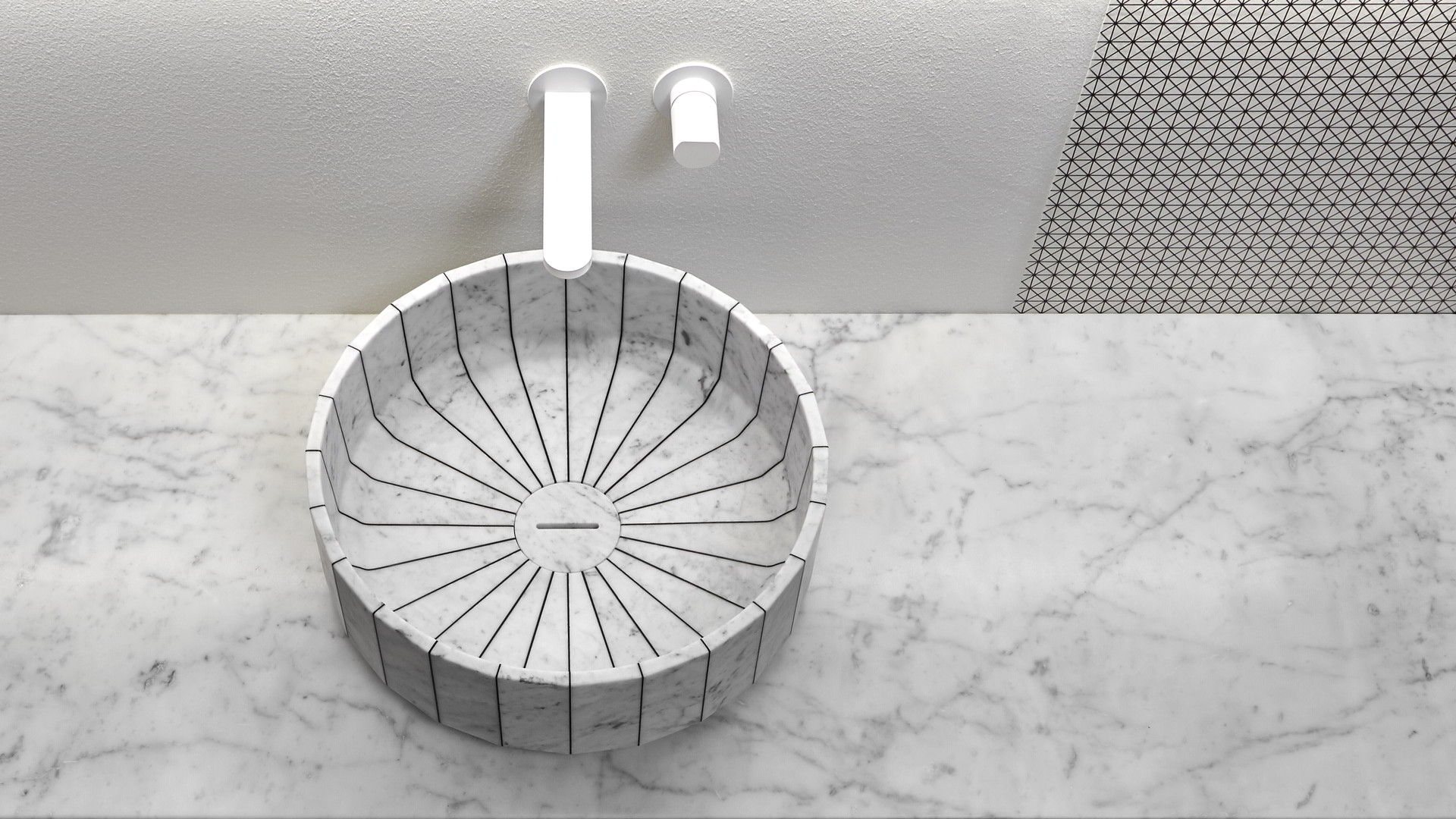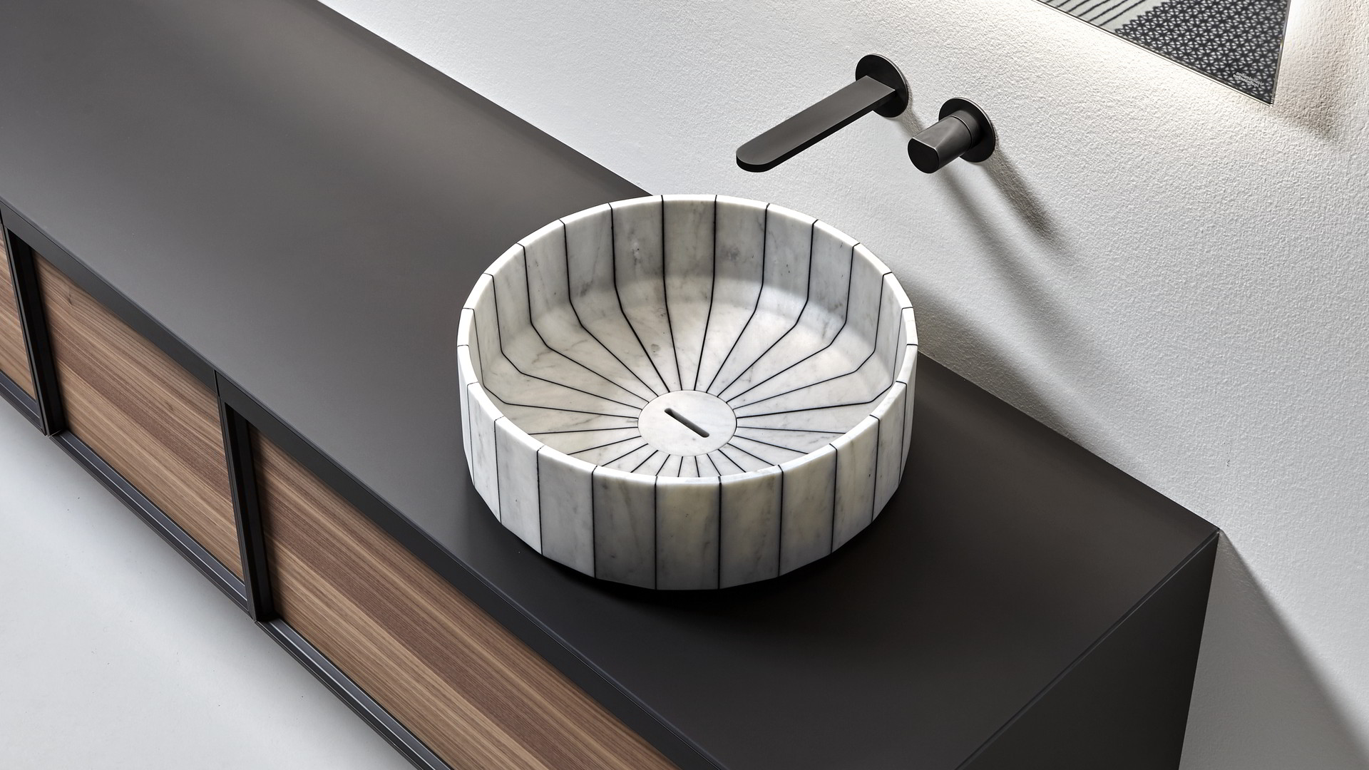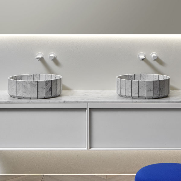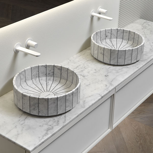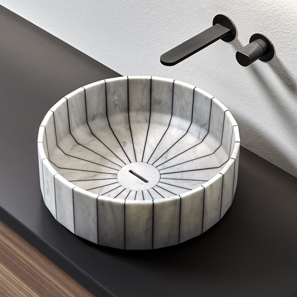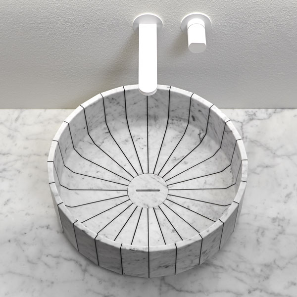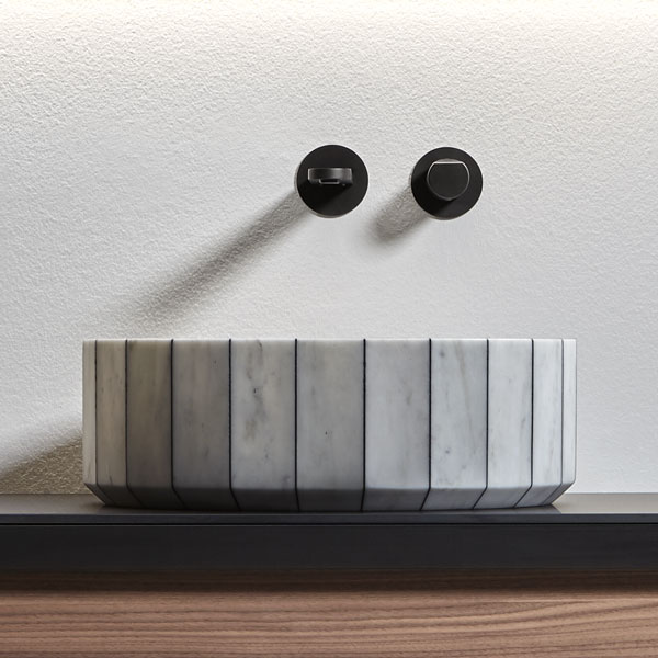 Its image is solid and statuary as that of a single block carved into the stone and polished by water. Its volume is instead generated by the assembly of individual segments interlaid by a black or white resin. Fonte, the countertop sink, which recalls the image of stone sinks traditionally present in rural and mountain areas. A continuous reference to the power of water and its importance in regulating human life, a continuous leap between past and present, between natural and artificial, between the infinite potential of nature and man's thought.