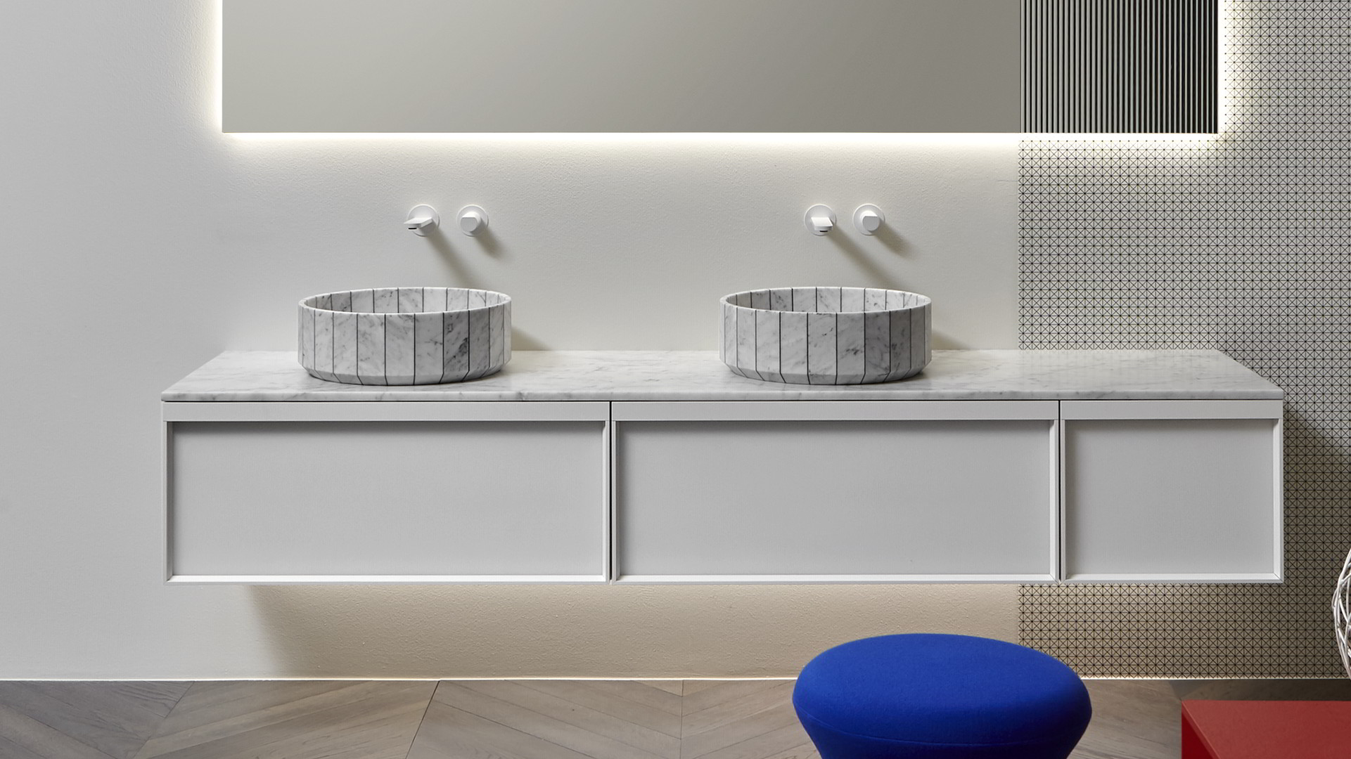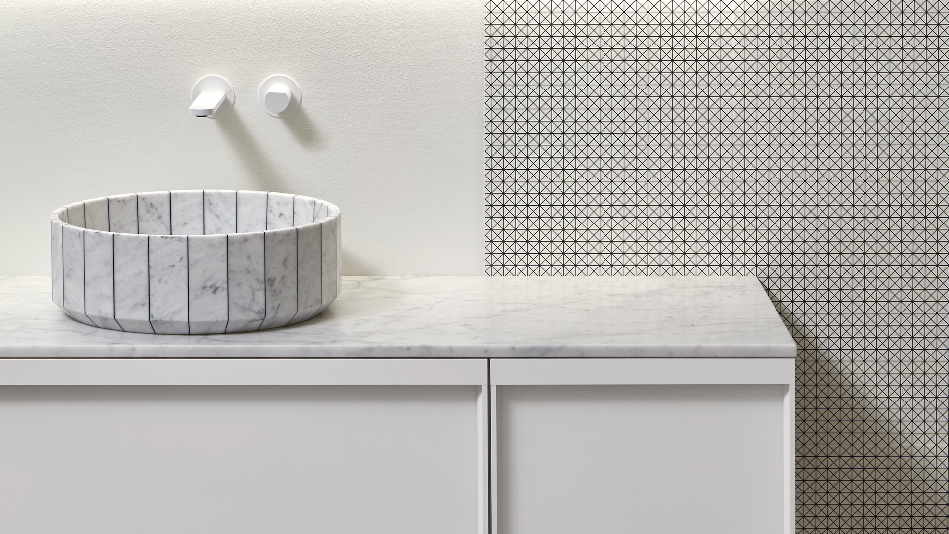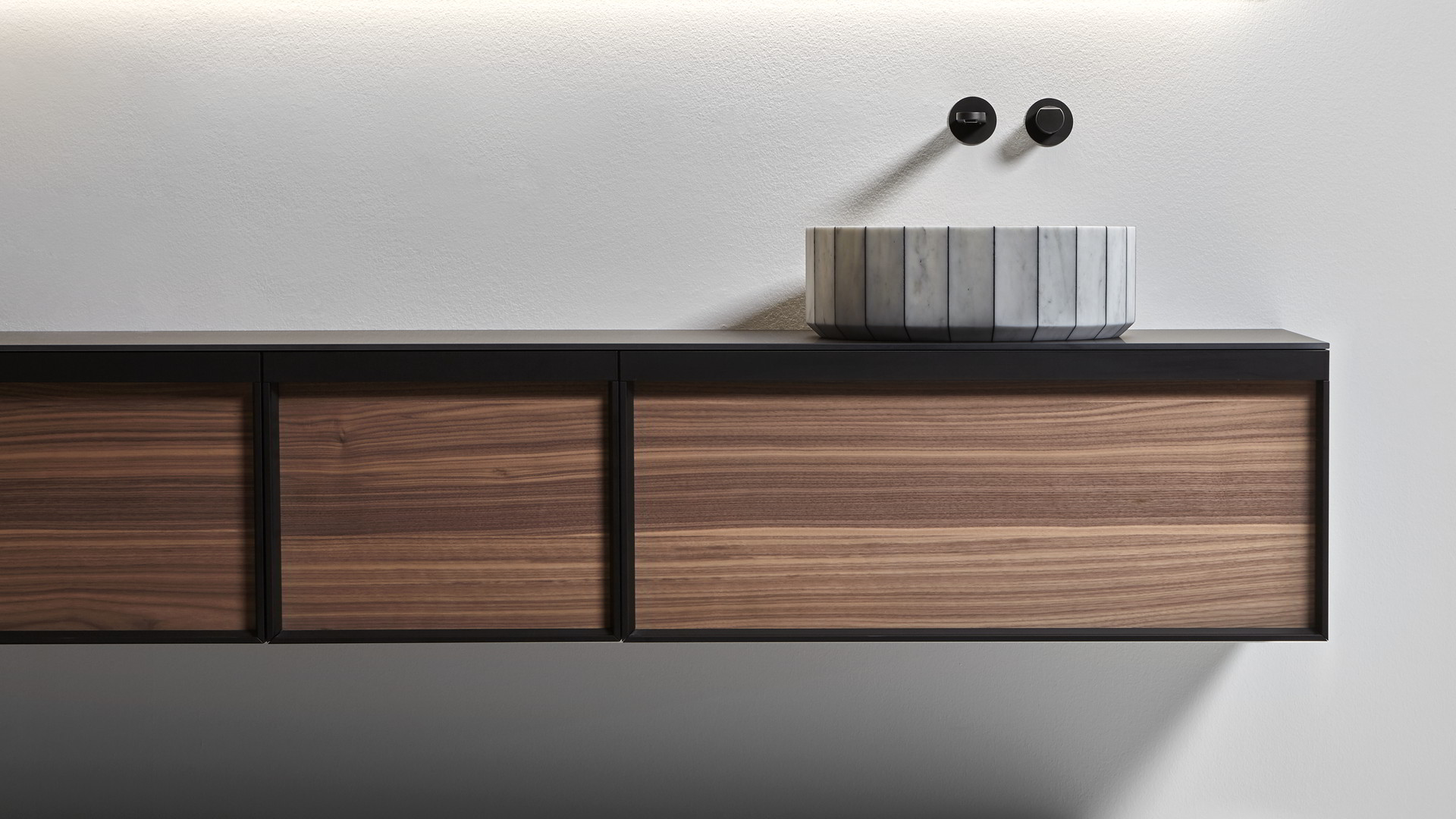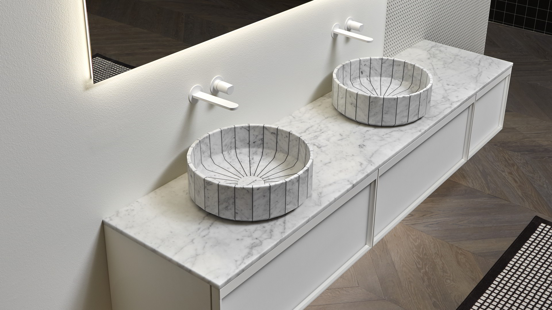 Its image is solid and statuary as that of a single block carved into the stone and polished by water. Its volume is instead generated by the assembly of individual segments interlaid by a black or white resin. Fonte, the countertop sink, which recalls the image of stone sinks traditionally present in rural and mountain areas. A continuous reference to the power of water and its importance in regulating human life, a continuous leap between past and present, between natural and artificial, between the infinite potential of nature and man's thought.