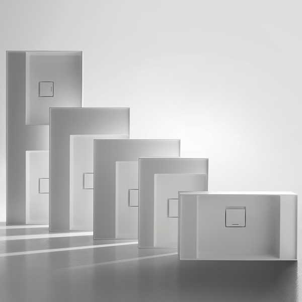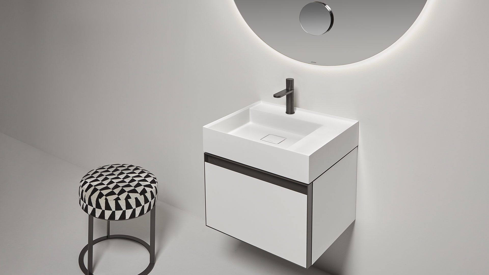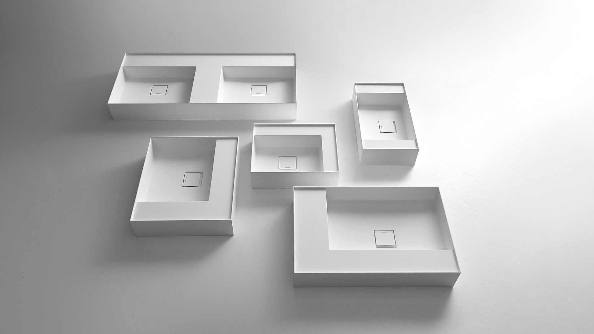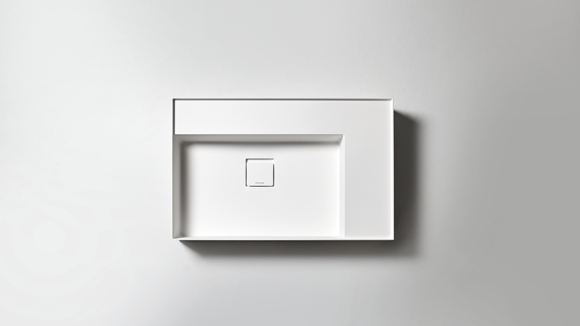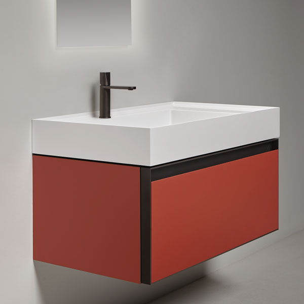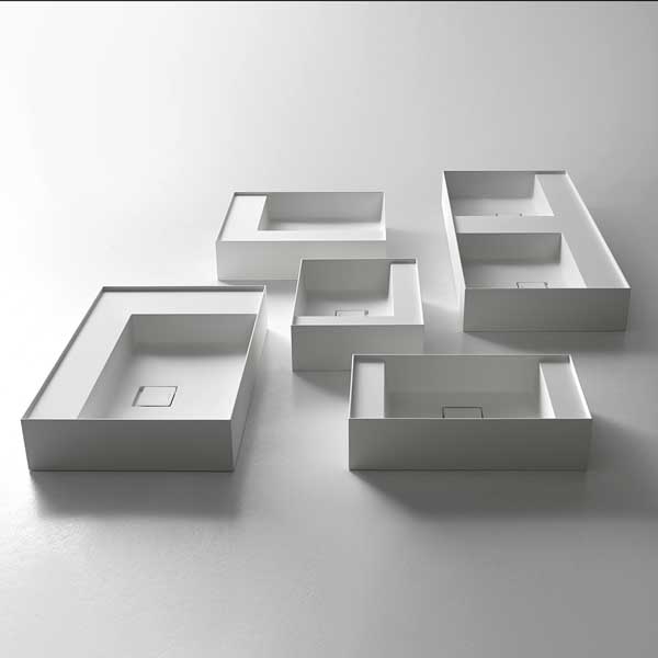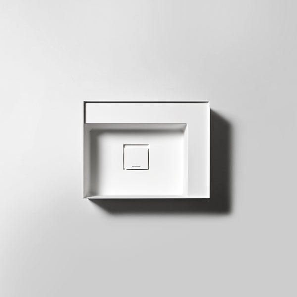 New proportional and formal balance born from the intersection of squares, circles, and rectangles, alternation of smooth and raised areas that capture unexpected three-dimensionality. Graffio is a collection of different washbasins, top or wall mount, made of Flumood, Colormood, Marble or Stone. The extreme thinness of the borders define a perimeter that encloses all the functions of the basin: the basin, the back surface where to install the faucet as well an additional surface.