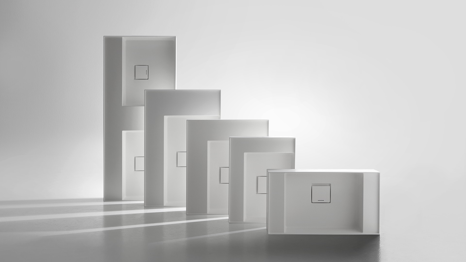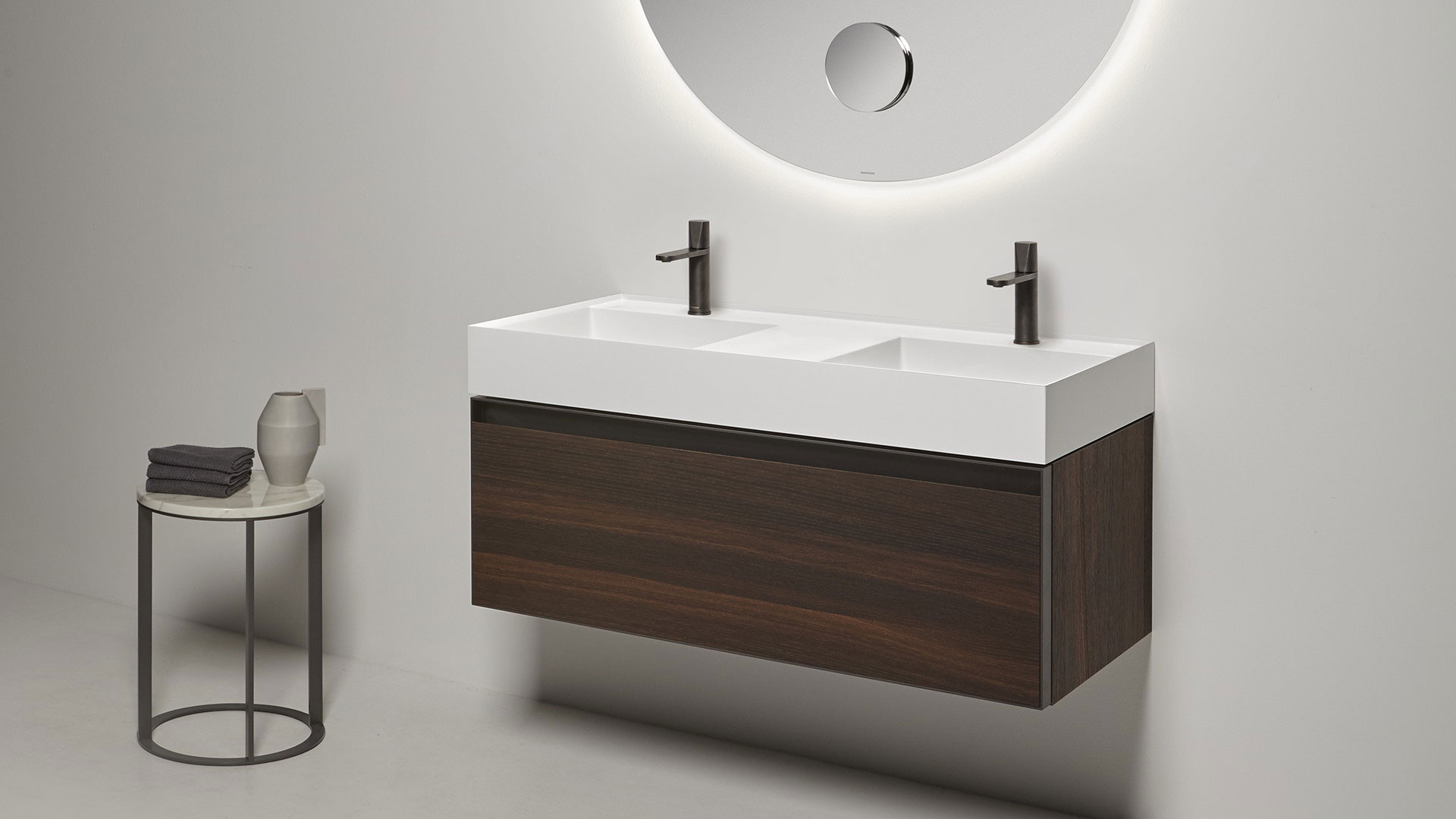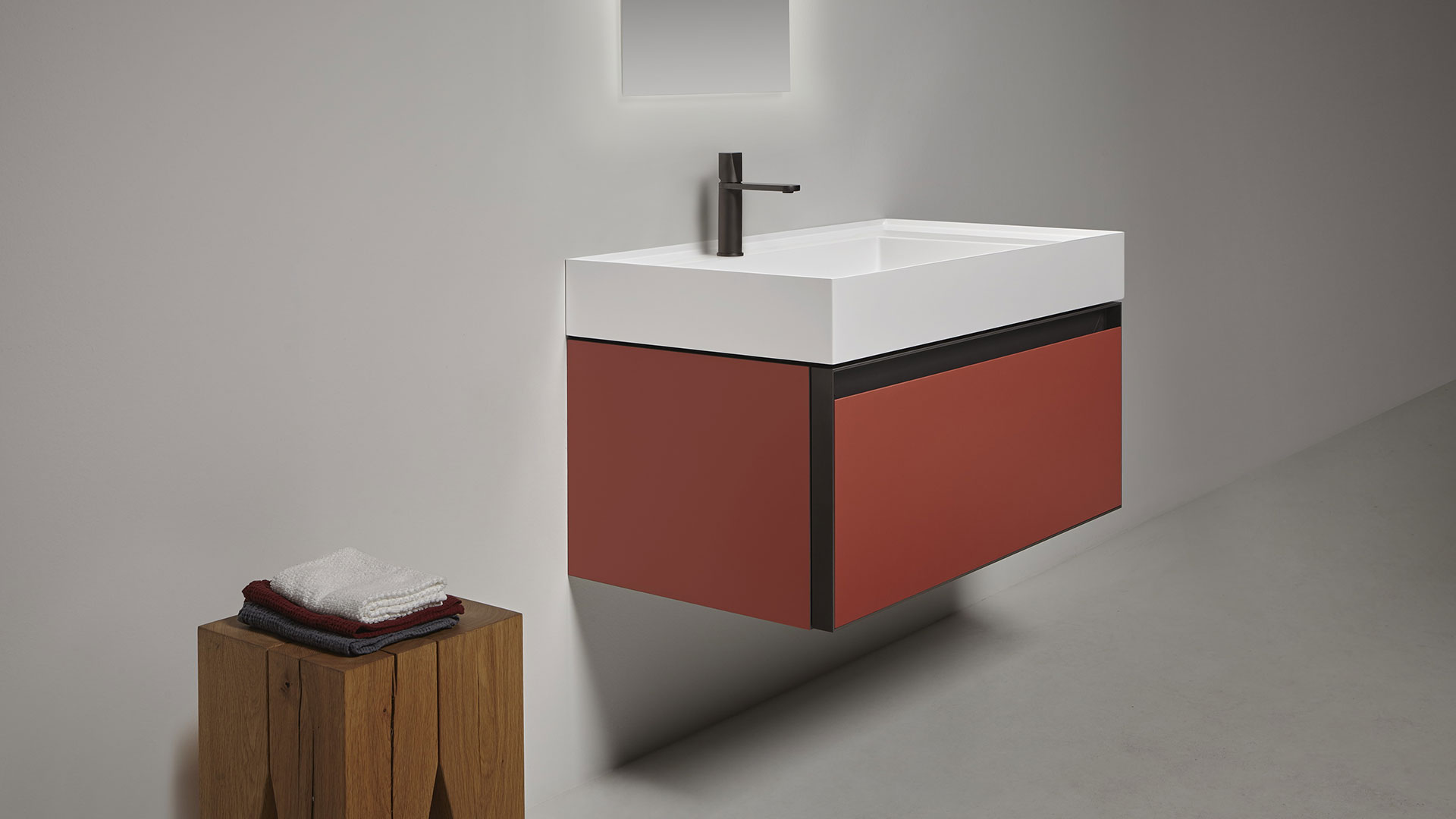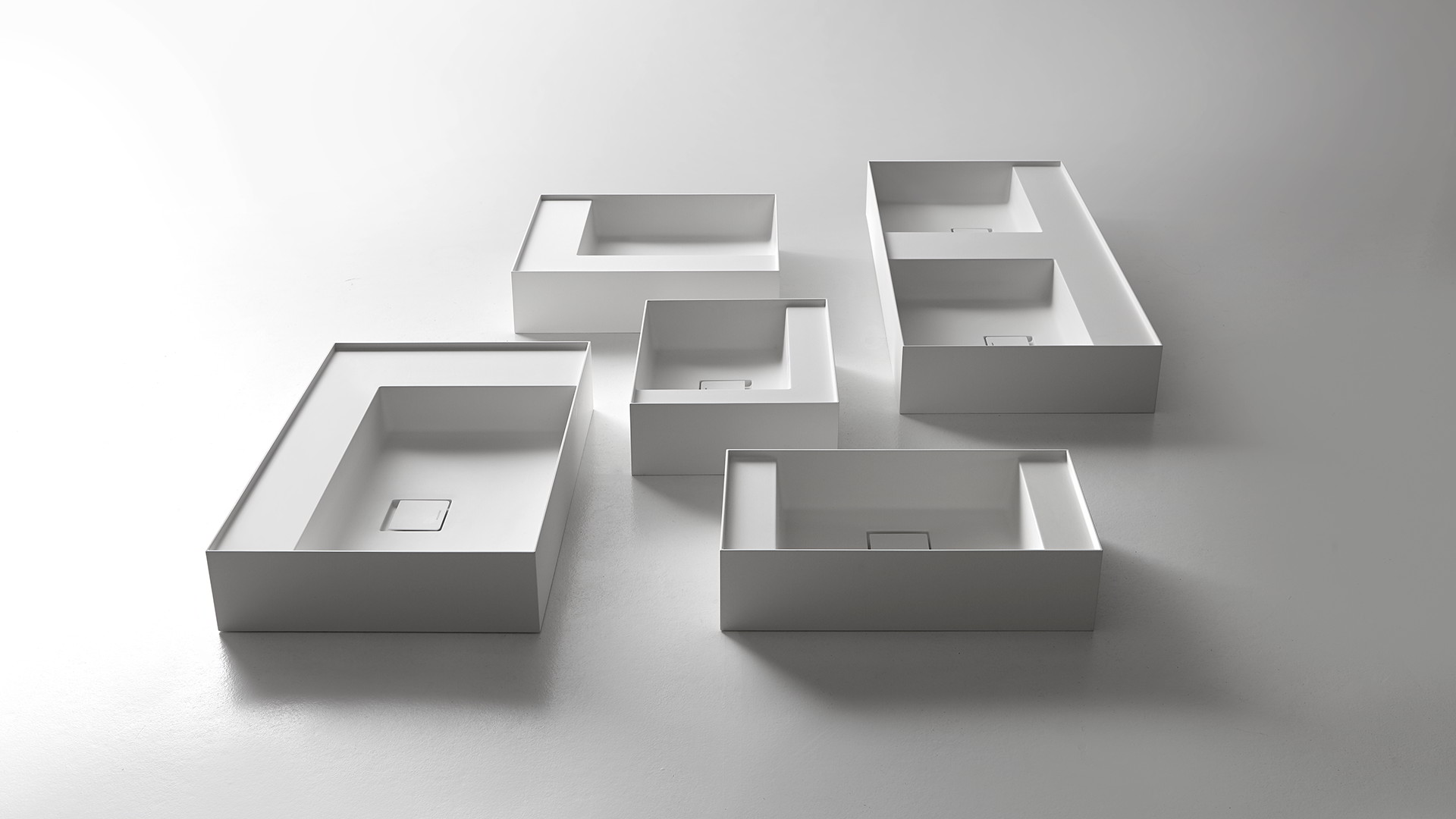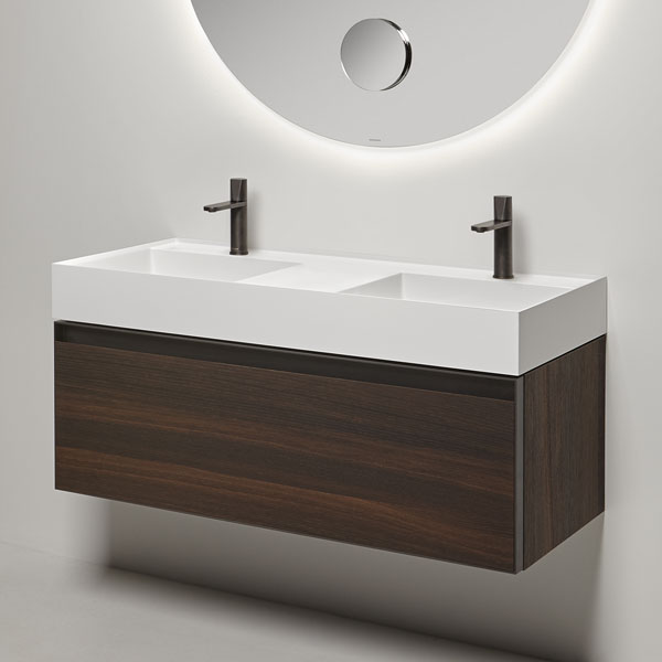 New proportional and formal balance born from the intersection of squares, circles, and rectangles, alternation of smooth and raised areas that capture unexpected three-dimensionality. Graffio is a collection of different washbasins, top or wall mount, made of Flumood, Colormood, Marble or Stone. The extreme thinness of the borders define a perimeter that encloses all the functions of the basin: the basin, the back surface where to install the faucet as well an additional surface.