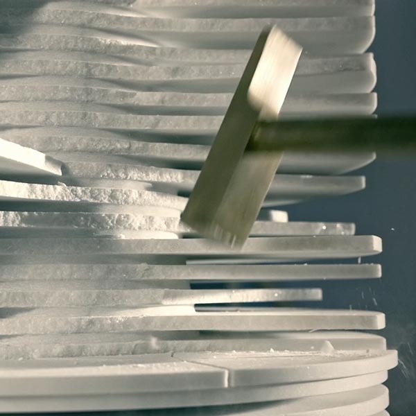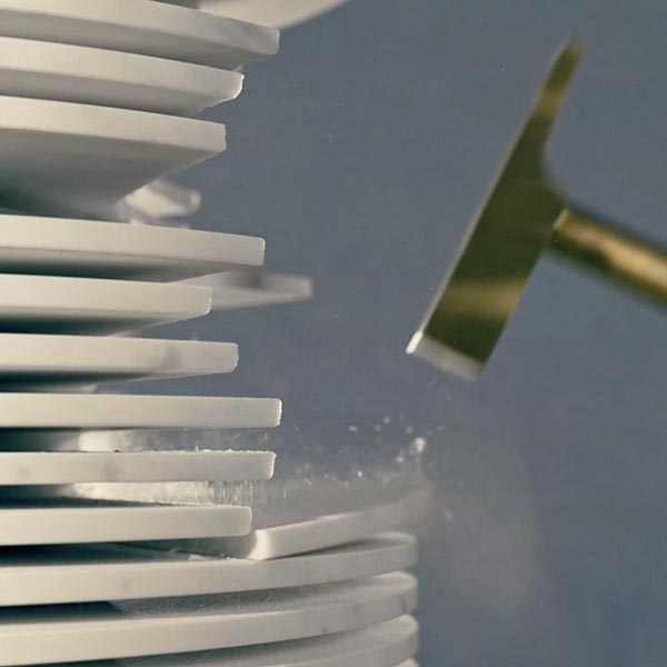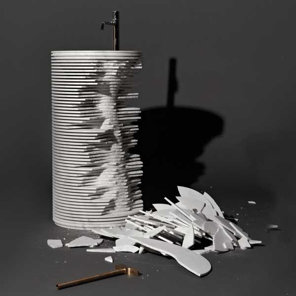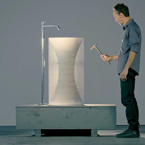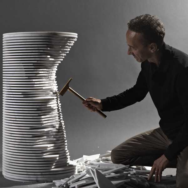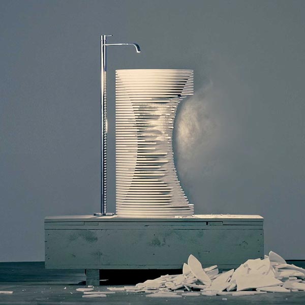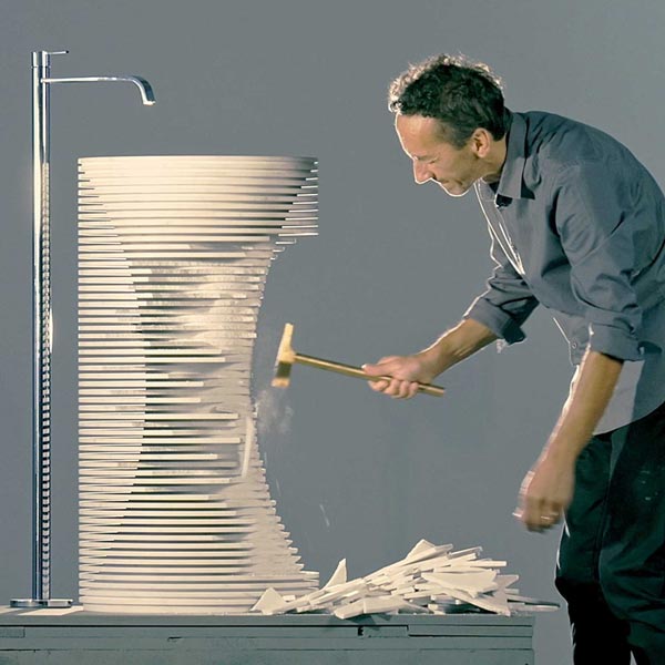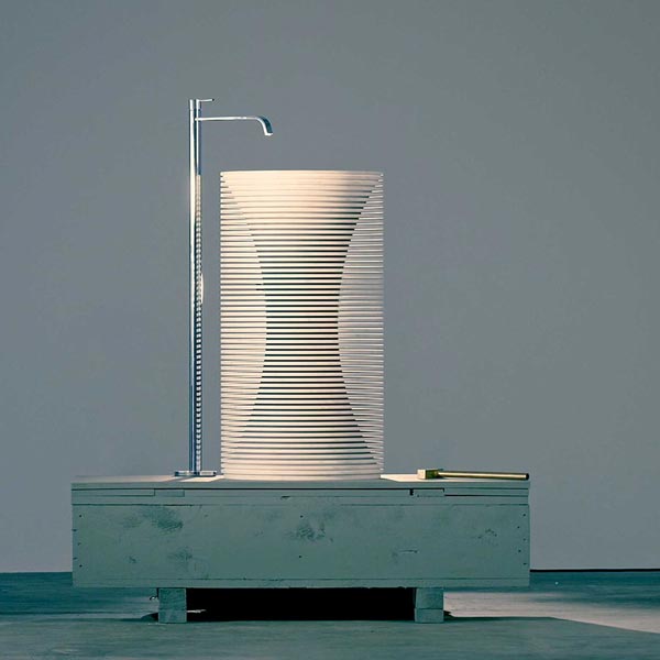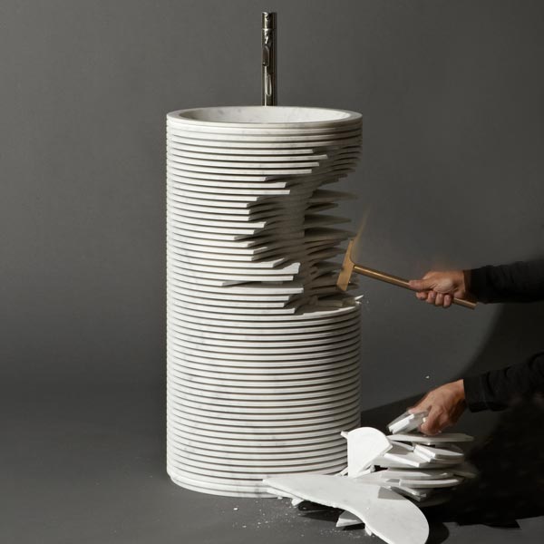 The shape within the form was the idea that accompanied from the very beginning the project by Paolo Ulian for antoniolupi.A project born by observing the first rough draft by machine of marble sculptures, in which the three-dimensional shape is outlined by a regular series of cuts managed by a numerical controlled machine. Thin strips of marble are formed, whose outer edges once broken, reveal the raw sculpture concealed inside.
