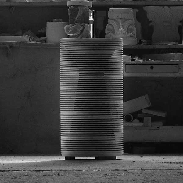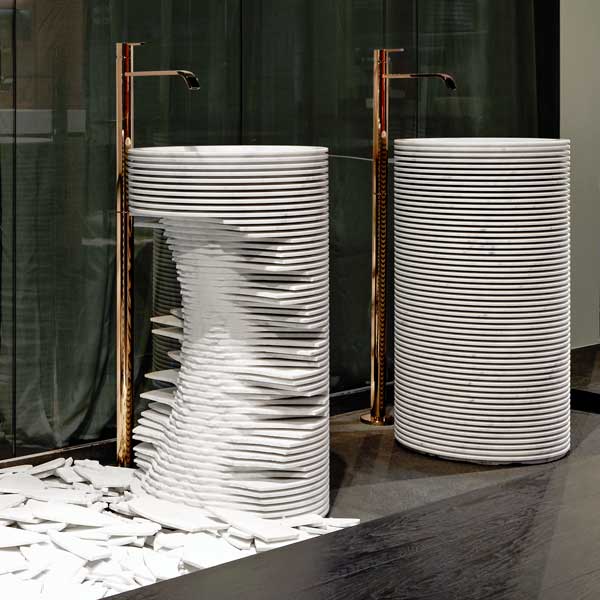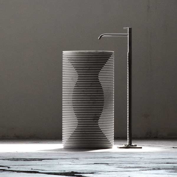 The same concept and process are used in the realization of the Introverso sink: a white Carrara marble block, machined and lightened by a series of cuts that reveal its internal core, the shape inside the shape. The marble block loses its monolithic appearance and is transformed into something ethereal, transparent, enclosing a core secret.