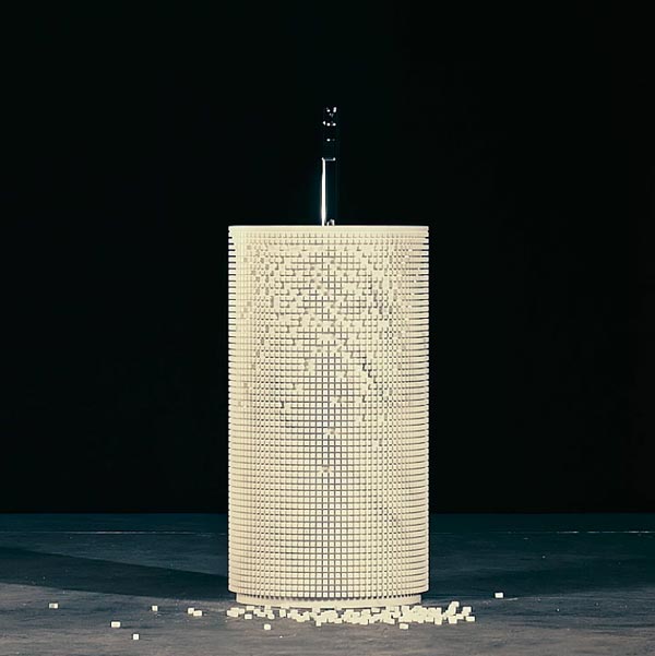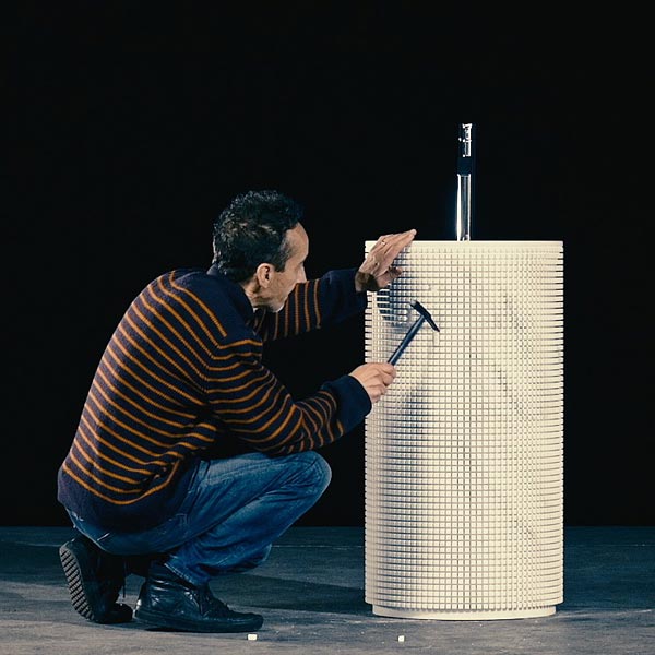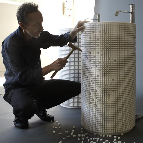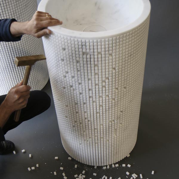 Tradition meets technology in a decomposed standardized form, sectioned, intersected by an orthogonal lattice, a cylindrical volume on which the machine has mapped out a clear and definite sign according to a project that leaves open endless possibilities of composition. A freestanding ever-changing sink due to the elimination of pieces imagination can take shape, the image is revealed, the essence comes to light. Lights and shadows, depth and reliefs, combinations and distances, connections and insulation. The pixel game that forms the basin is completely oriented on consequentiality, on proximity, on decorum that comes from the material itself. A gesture, that of subtraction, revealing the shape, which allows you to customize the volume, and which amplifies the three-dimensional design of the project. Pixel is subtraction to compose.