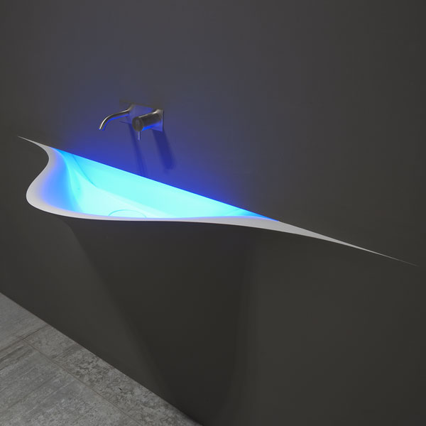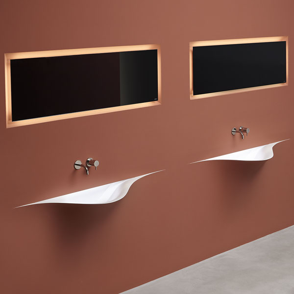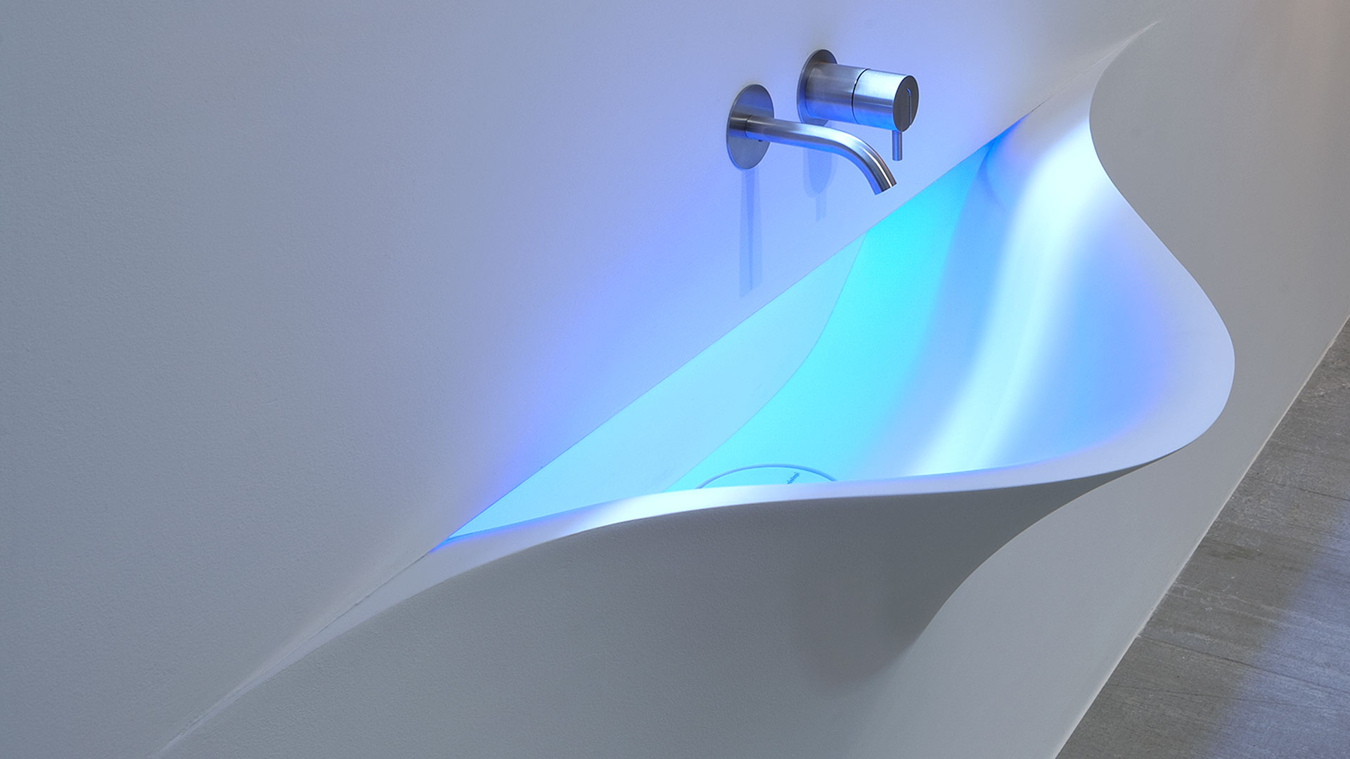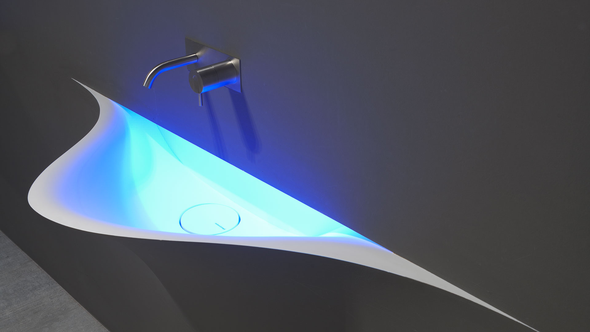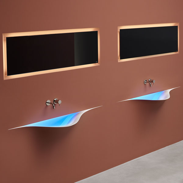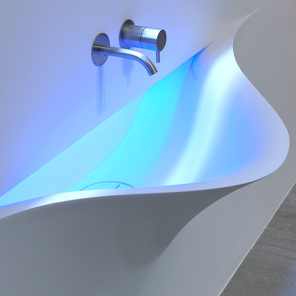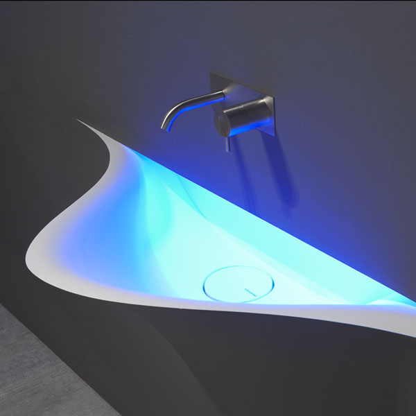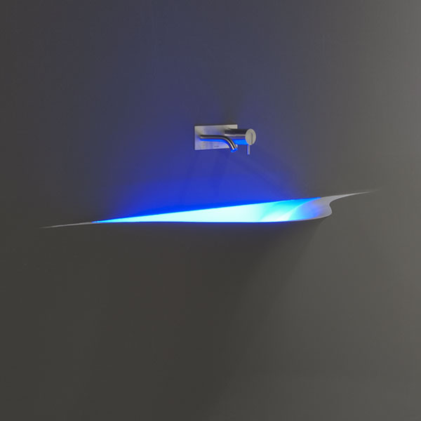 A bare sink made entirely in Moodlight and than seamlessly integrated in the wall which blends best when the same material and colours as the wall are used to complete it. The sinuous movement can be emphasized with the perfection of the finish and absolute continuity of the coating that leaves colour as the lead player and light the role to exalt it showing that something magical is happening.