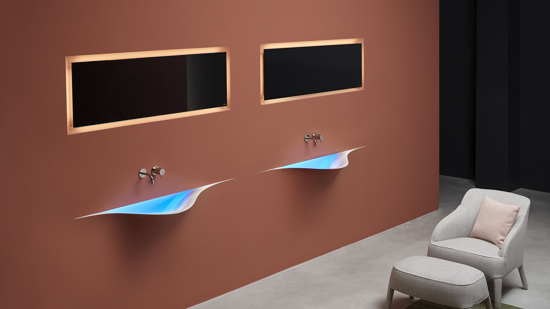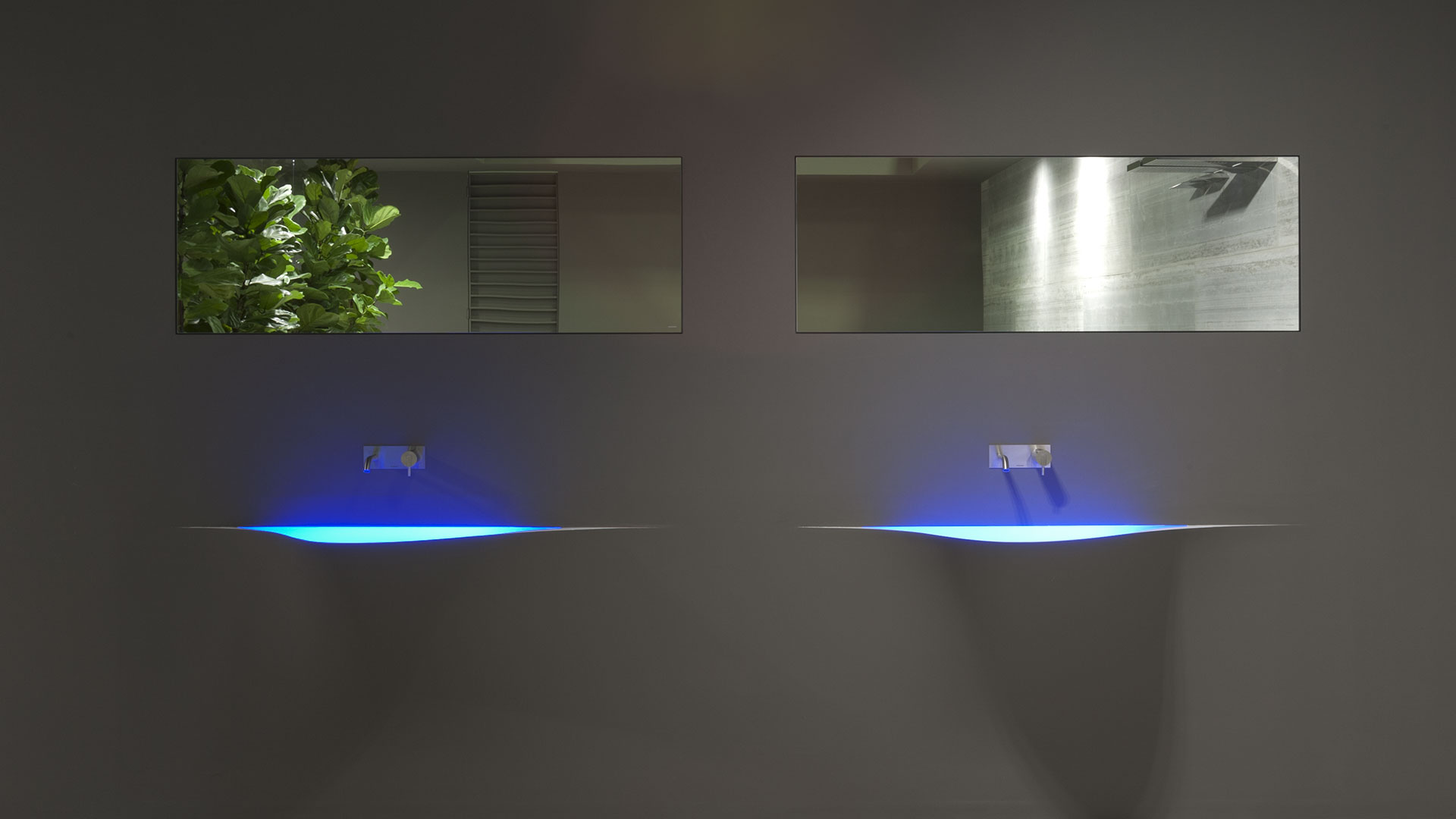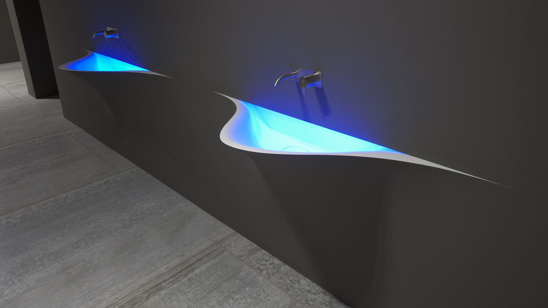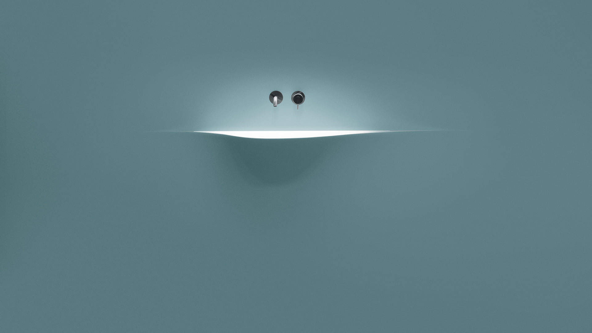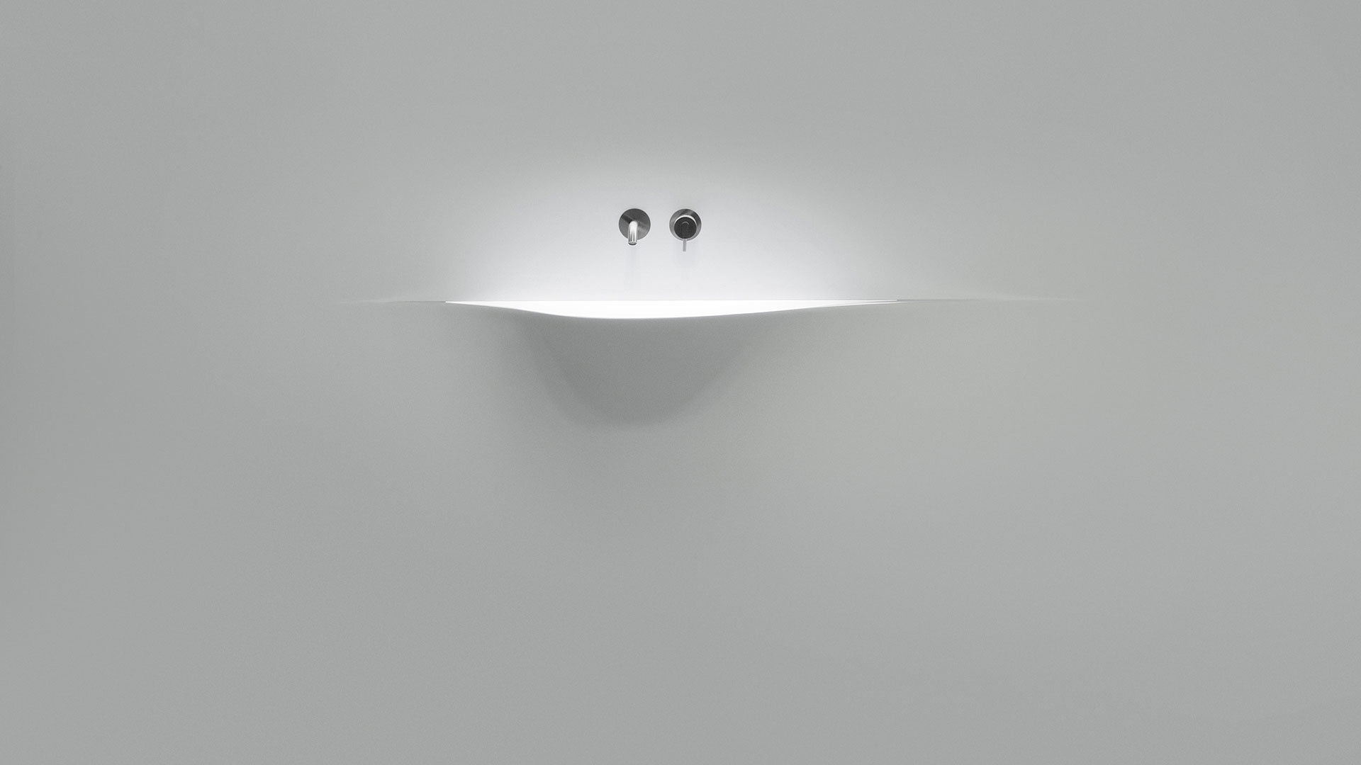A bare sink made entirely in Moodlight and than seamlessly integrated in the wall which blends best when the same material and colours as the wall are used to complete it. The sinuous movement can be emphasized with the perfection of the finish and absolute continuity of the coating that leaves colour as the lead player and light the role to exalt it showing that something magical is happening.