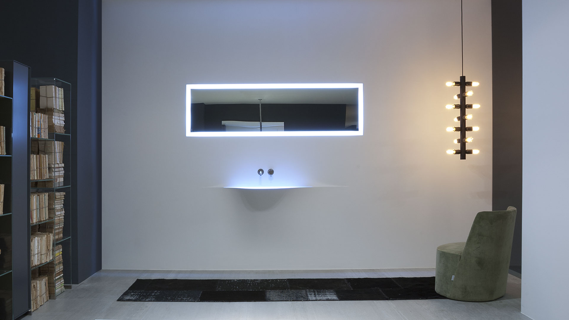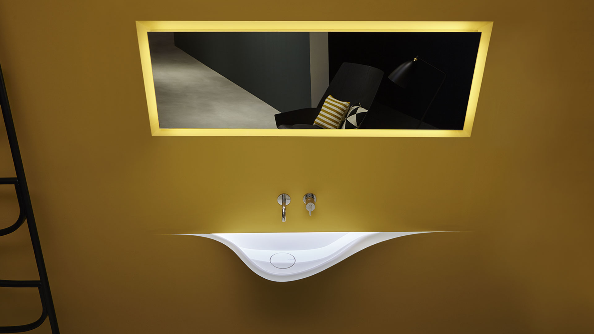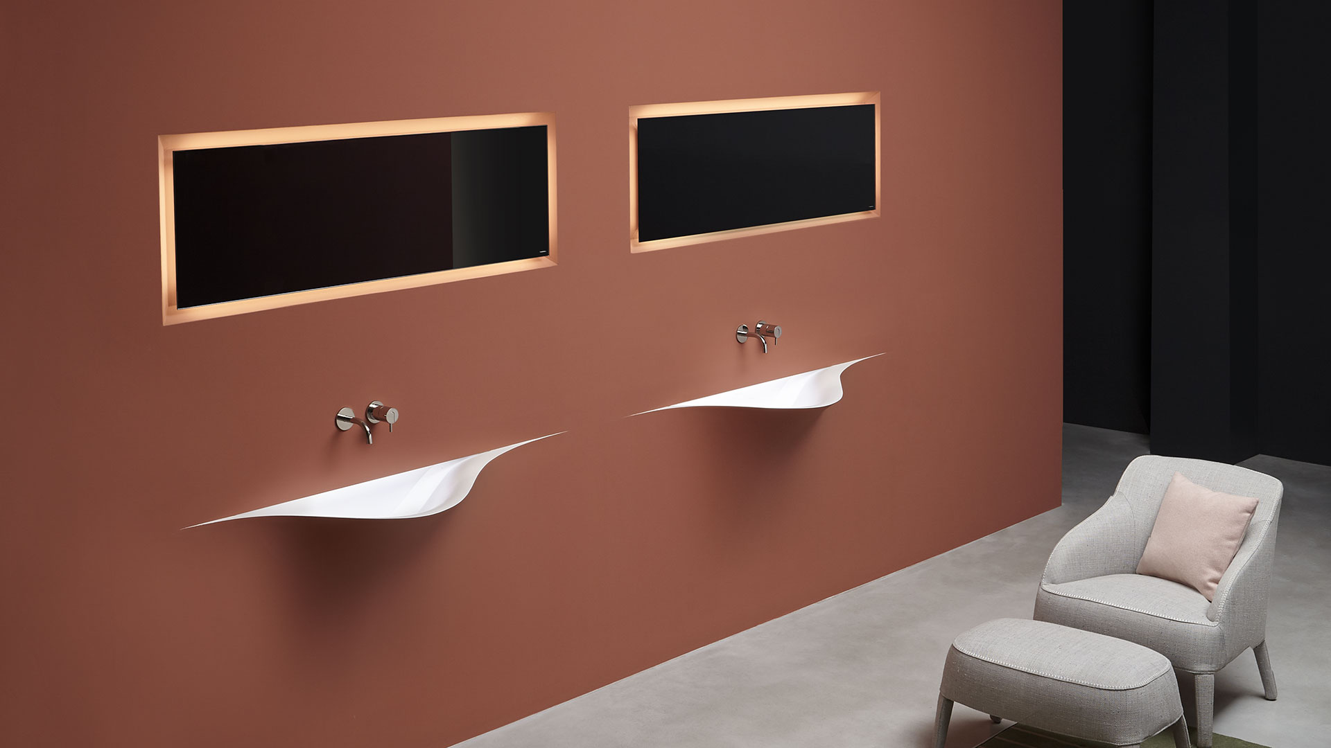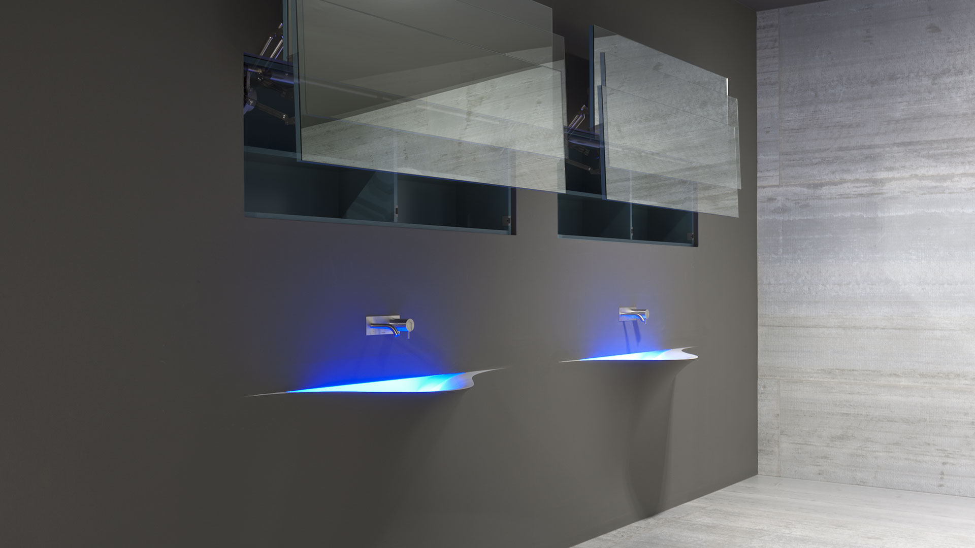 A bare sink made entirely in Moodlight and than seamlessly integrated in the wall which blends best when the same material and colours as the wall are used to complete it. The sinuous movement can be emphasized with the perfection of the finish and absolute continuity of the coating that leaves colour as the lead player and light the role to exalt it showing that something magical is happening.