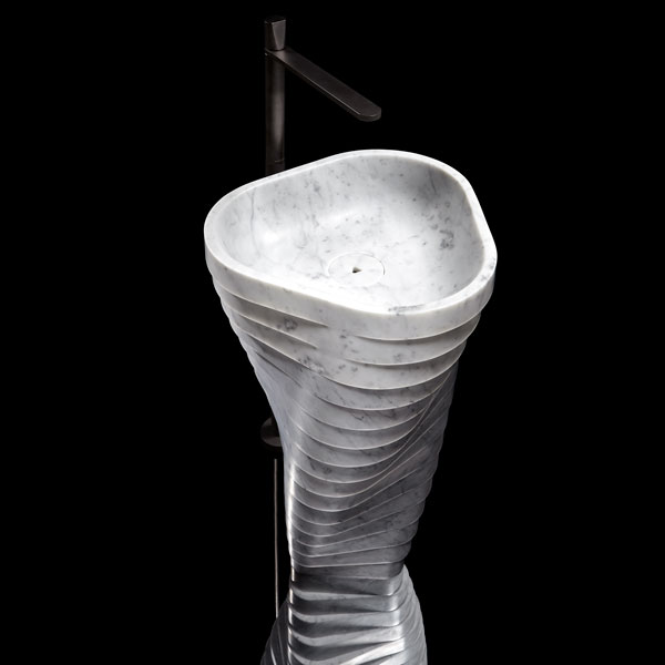 In Vortice, matter takes shape through human thought and the use of advanced processing technologies. A project that best expresses this virtuous cycle between nature, man and machine. Vortice is born from the earth, or rather from the quarry, when the marble block is extracted. It has a small base and develops upward through a revolving movement generating fluid and sinuous geometries accentuated by the unique veins and the plastic like behavior of the material.