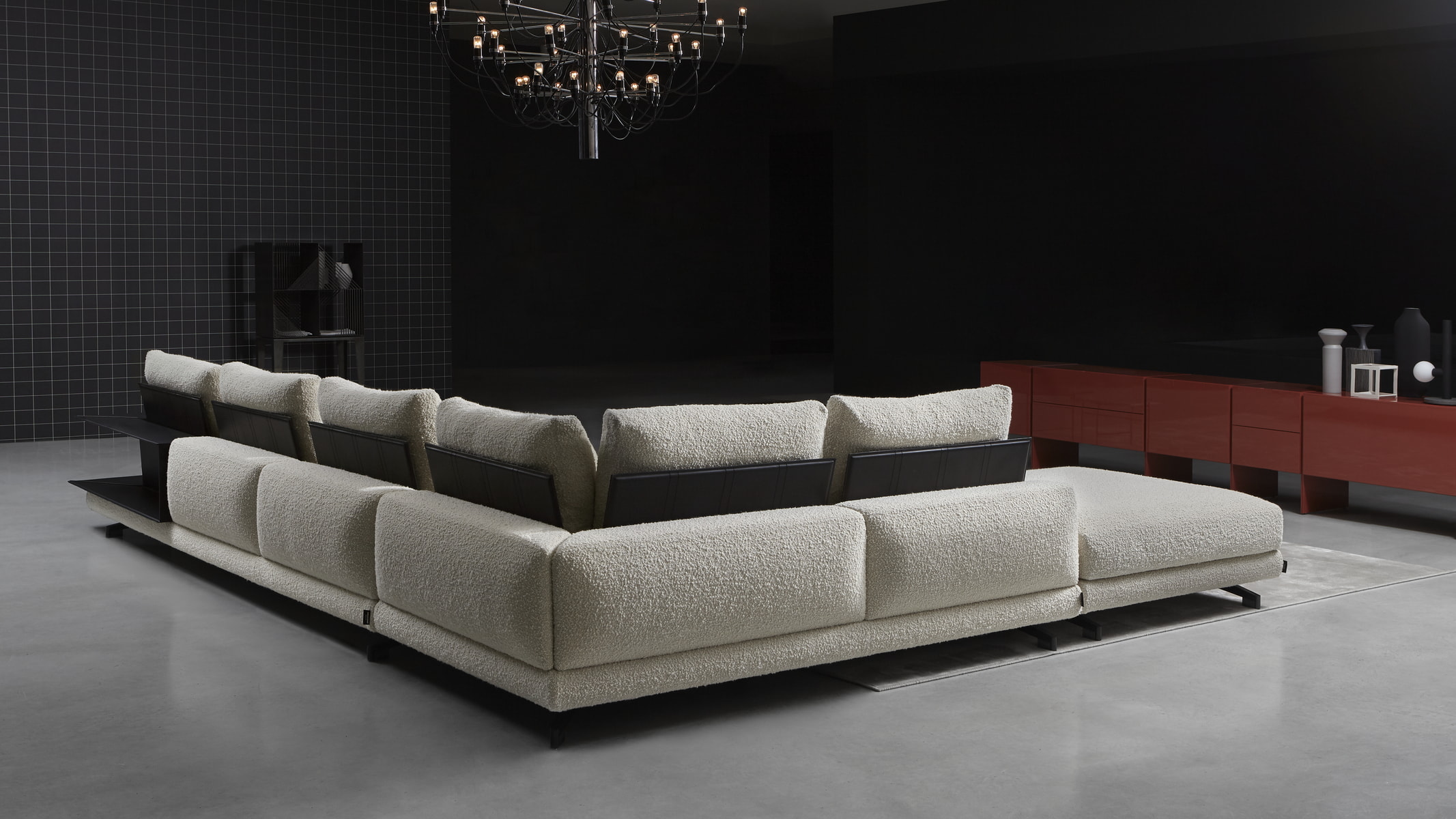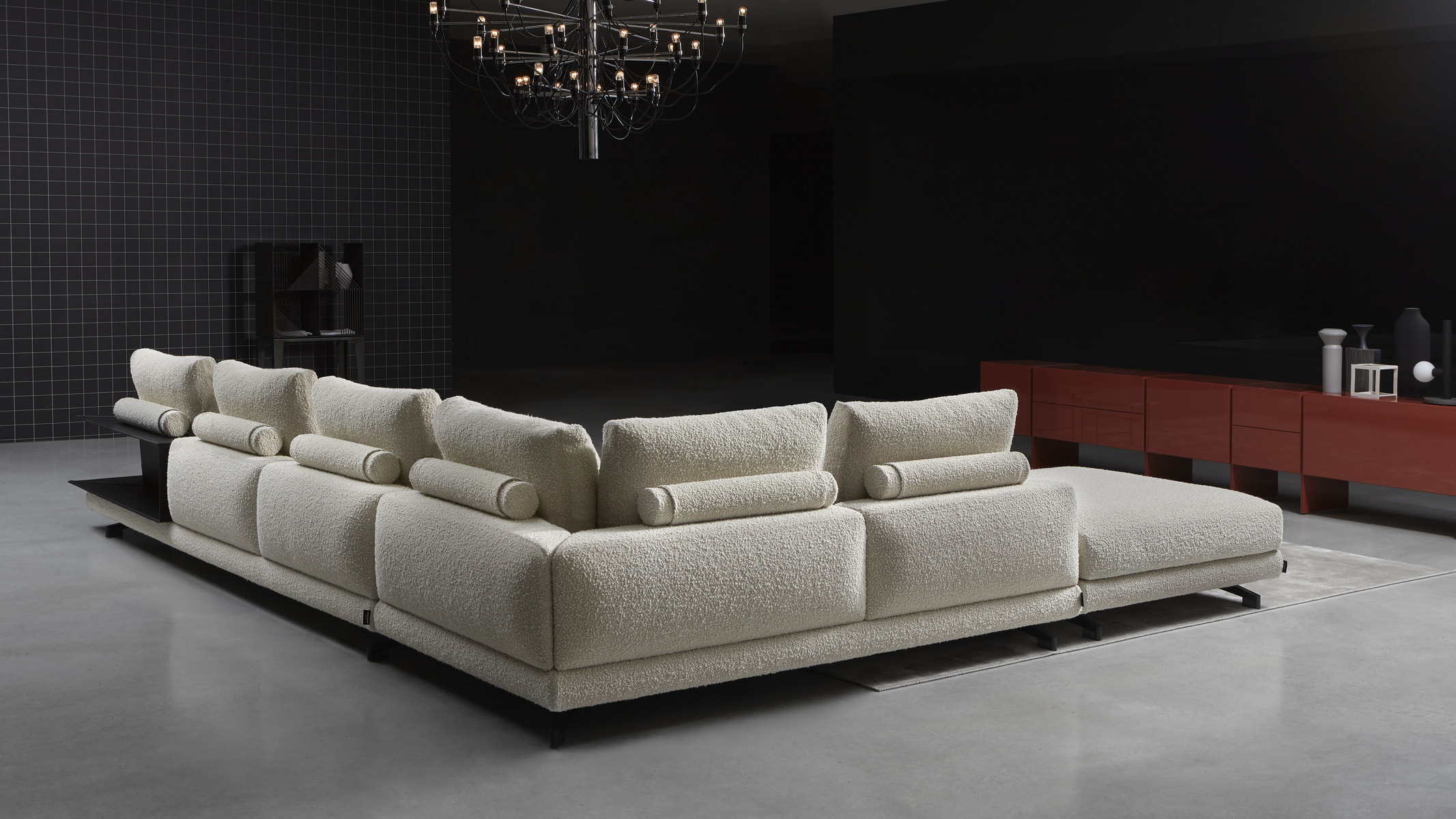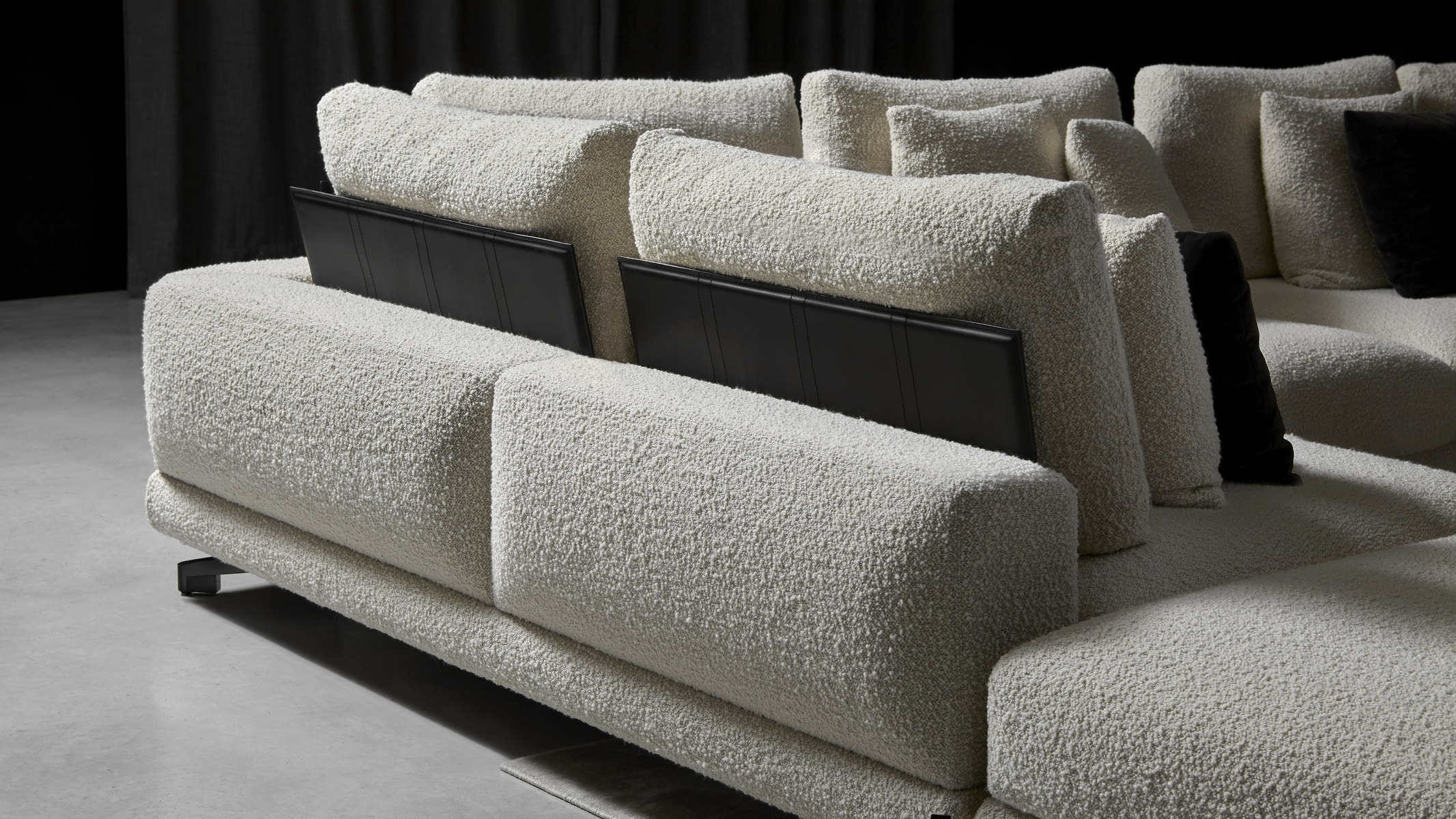 A domestic architecture with square shapes, a sequence of volumes, of solids and voids that come together to create an important island, even a large one; a series of rigid elements, of geometric angles, designed with rigor, thin thicknesses and proportional balance. The elegance of the Neverland sofa is expressed in the choice of materials and the possible combinations that define a spacious, elegant, and tailored relaxation space. The corner elements serve as practical shelves and allow books and objects to be stored, increasing the functionality of the sofa, and effectively enhancing the back of the sofa as well. Neverland is available in a variety of sizes and combinations, with black chrome painted aluminum feet, back rests and upholstery in a wide choice of fabrics and leathers. The small footprint of the leg and feet, some of which are not visible, give the sofa a feeling of lightness and suspension.
