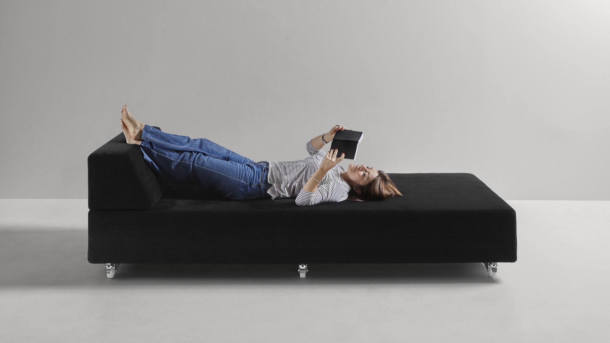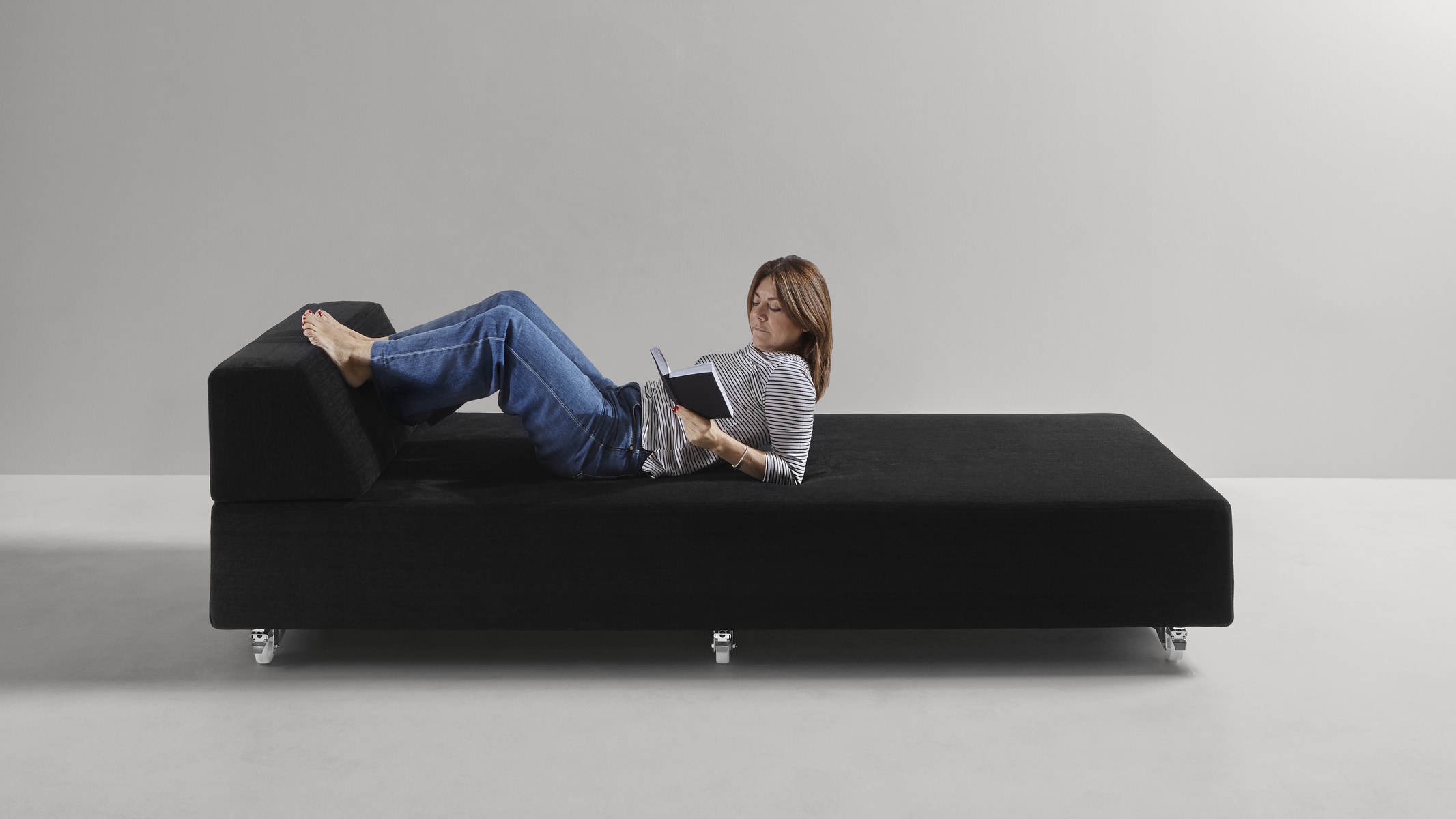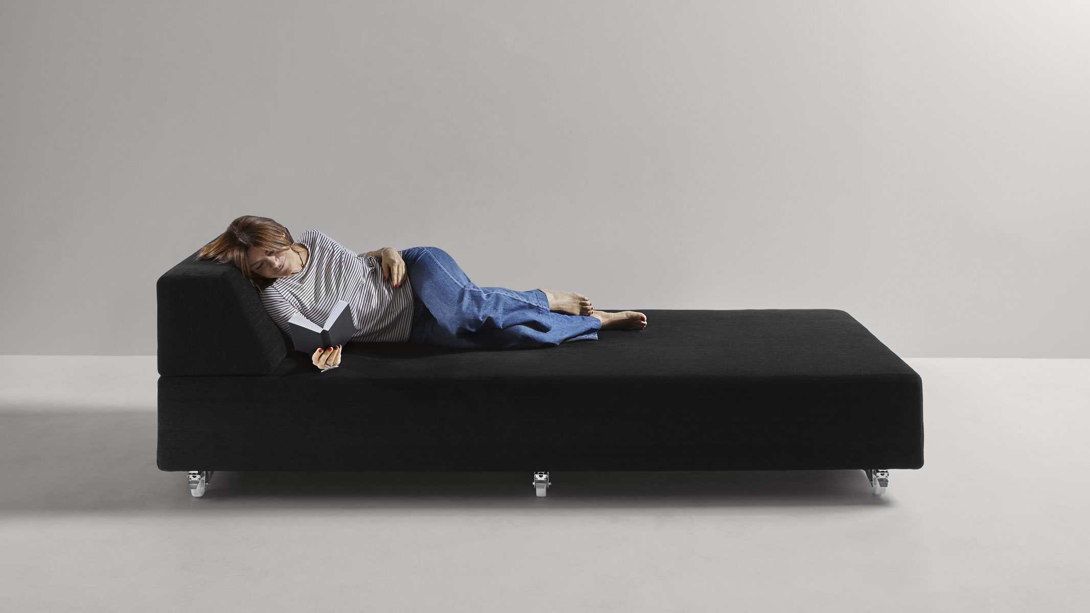 Modularity, with absolute freedom. A concept that stems from the primitive approach to design, or rather spontaneous construction, that children have when they juxtapose, superimpose, balance cubes or geometric solids following only instinct and imagination. As in the simplest and often successful ideas, the Teorema upholstered furniture system is reduced to the essentials, to two geometric figures that placed freely in space give way to infinite compositions. Just two elements that give origin to places of relaxation that can be broken down and recomposed at will, moved and relocated, rotated or paired. Everything stems from the pivotal element, the only unavoidable one, a pouff with squared shapes on top of which rest ballasted backrests and armrests, that is, which contain a weight, appropriately calibrated, that ensures their stability and the maintenance of the chosen position. There are no hinges or fastening systems; everything is free and changeable with a single gesture.