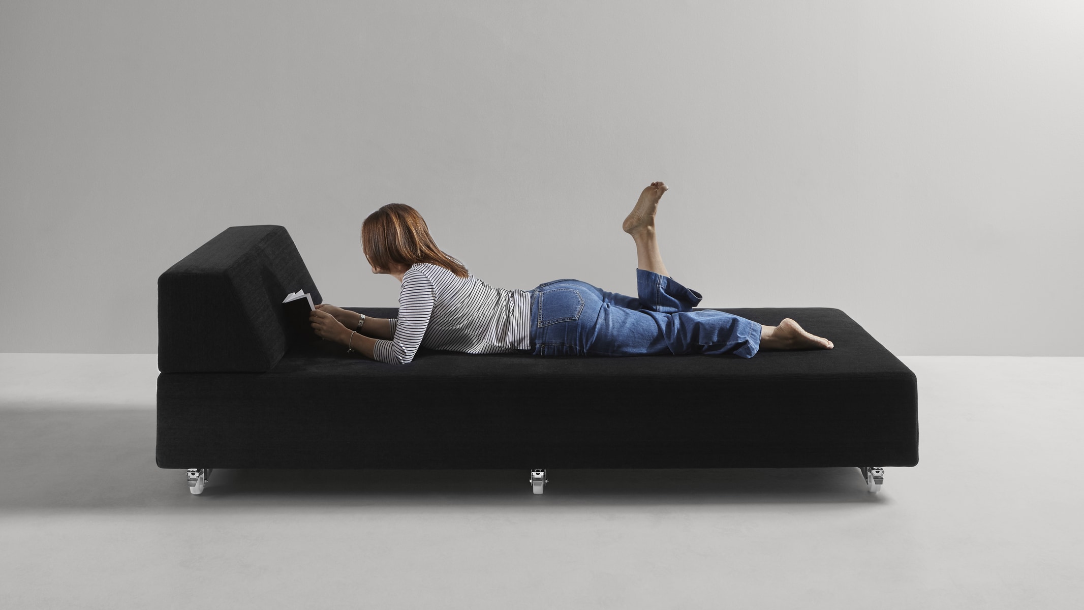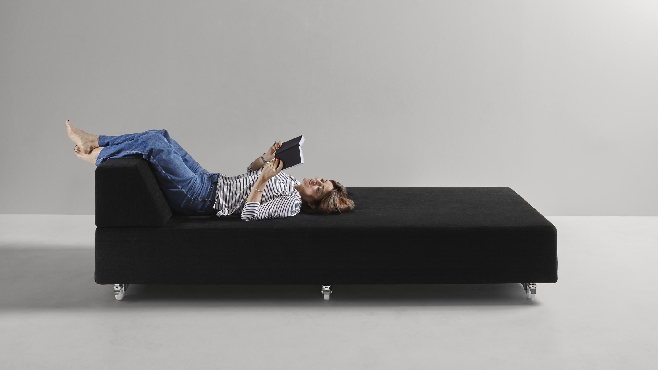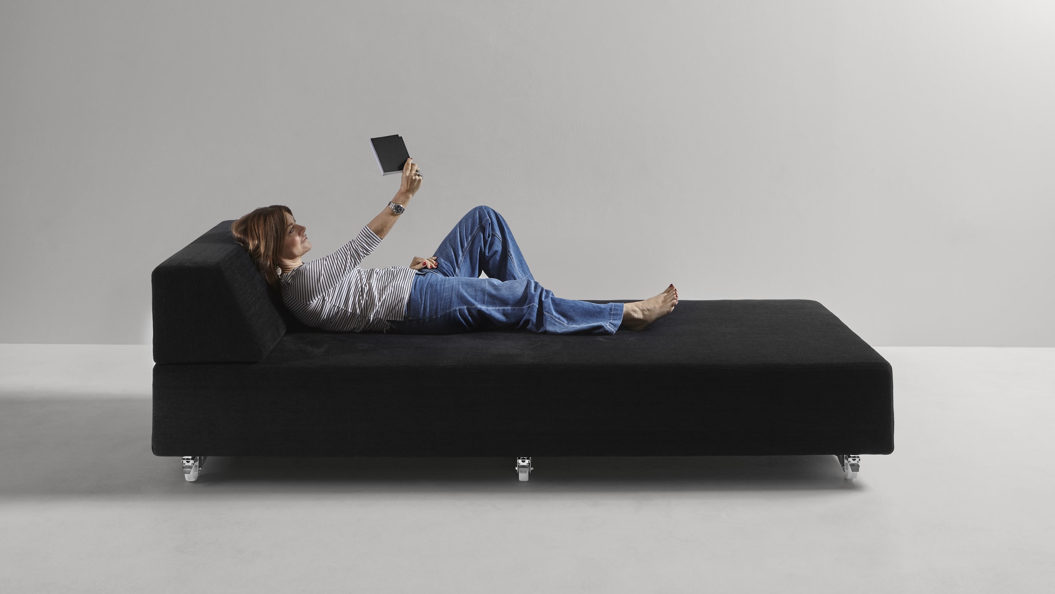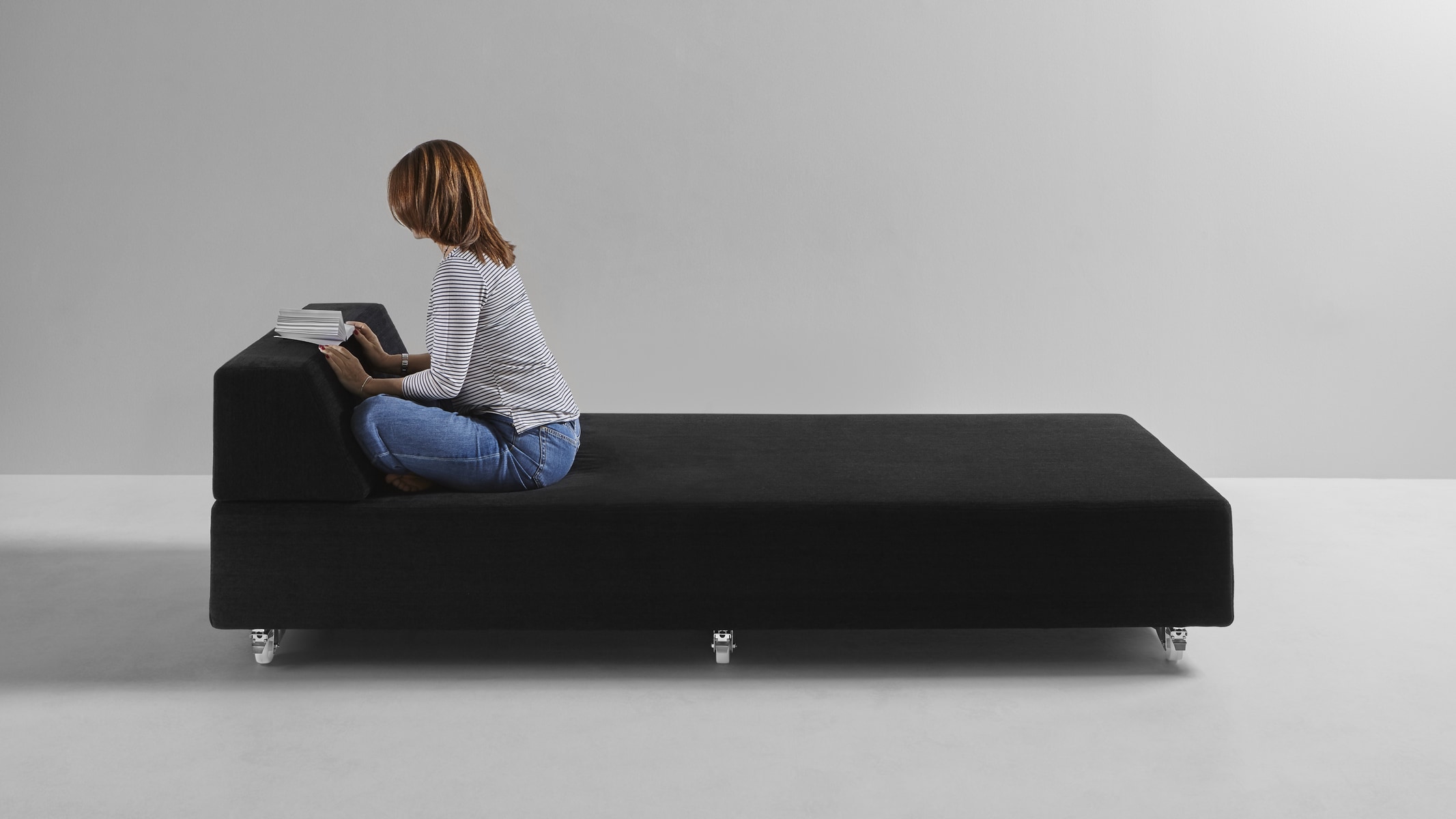 Modularity, with absolute freedom. A concept that stems from the primitive approach to design, or rather spontaneous construction, that children have when they juxtapose, superimpose, balance cubes or geometric solids following only instinct and imagination. As in the simplest and often successful ideas, the Teorema upholstered furniture system is reduced to the essentials, to two geometric figures that placed freely in space give way to infinite compositions. Just two elements that give origin to places of relaxation that can be broken down and recomposed at will, moved and relocated, rotated or paired. Everything stems from the pivotal element, the only unavoidable one, a pouff with squared shapes on top of which rest ballasted backrests and armrests, that is, which contain a weight, appropriately calibrated, that ensures their stability and the maintenance of the chosen position. There are no hinges or fastening systems; everything is free and changeable with a single gesture.