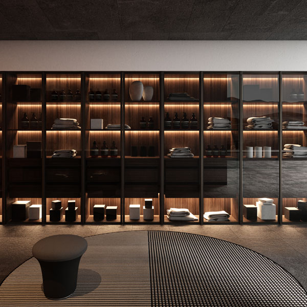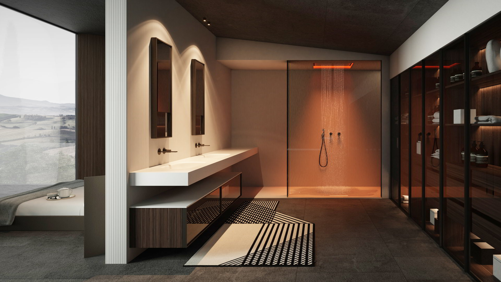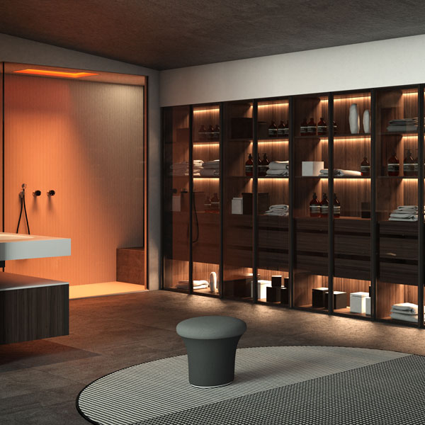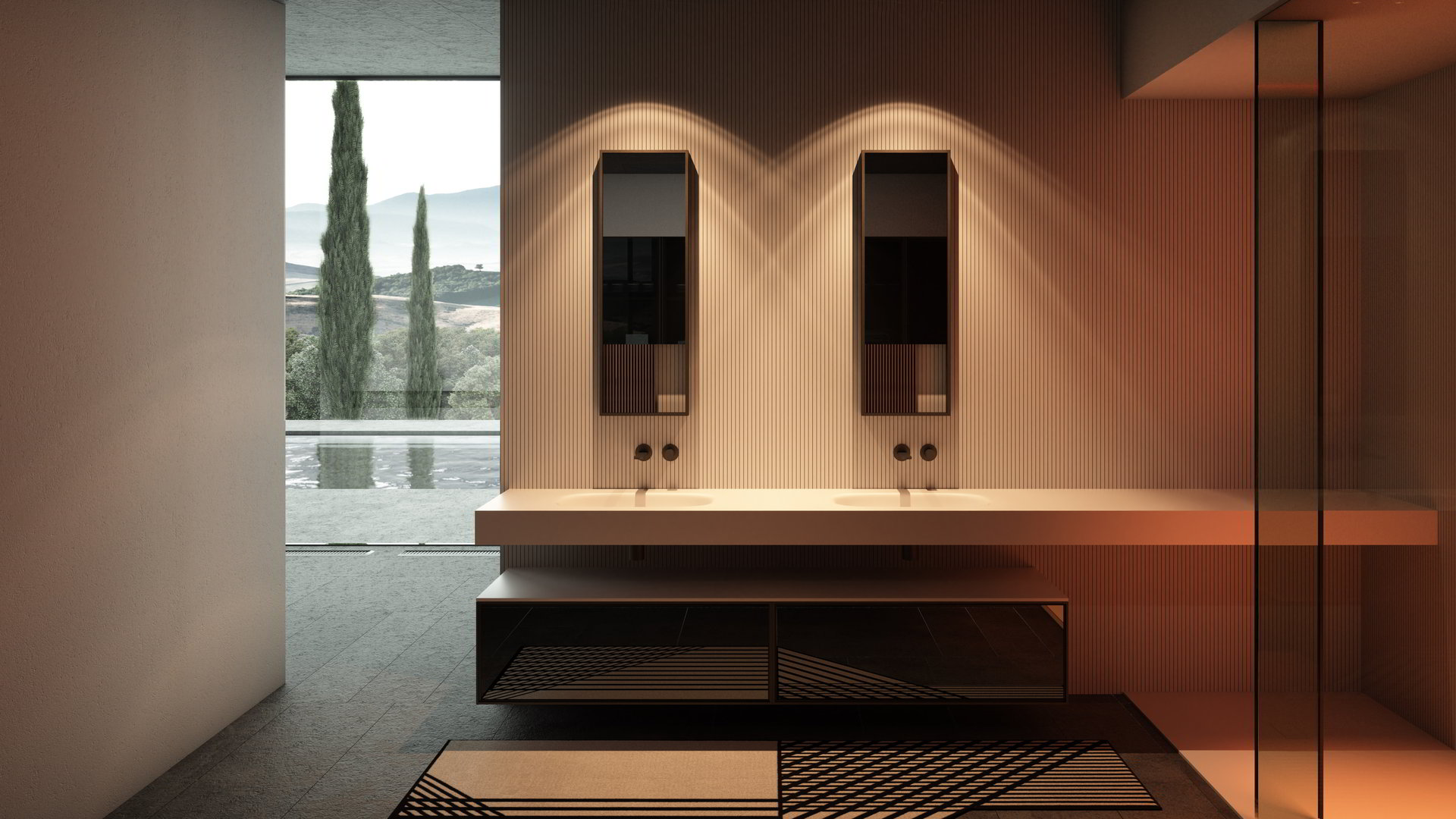 Collections differing in personality and character, but united by a coherence of style that gives taste and elegance to the entire house. Starting with the Dune freestanding bathtub designed by Mario Ferrarini which occupies the center of the master bathroom on the ground floor and offers absolute relaxation with a direct view of the outside, continuing with the series of Bespoke and BeMade containers designed by Carlo Colombo, where elegance and the richness of the finishes and materials furnish different environments. The use of mirrored doors lightens the image of the volumes and expands the perspectives by multiplying the paths drawn by the surfaces in the space.