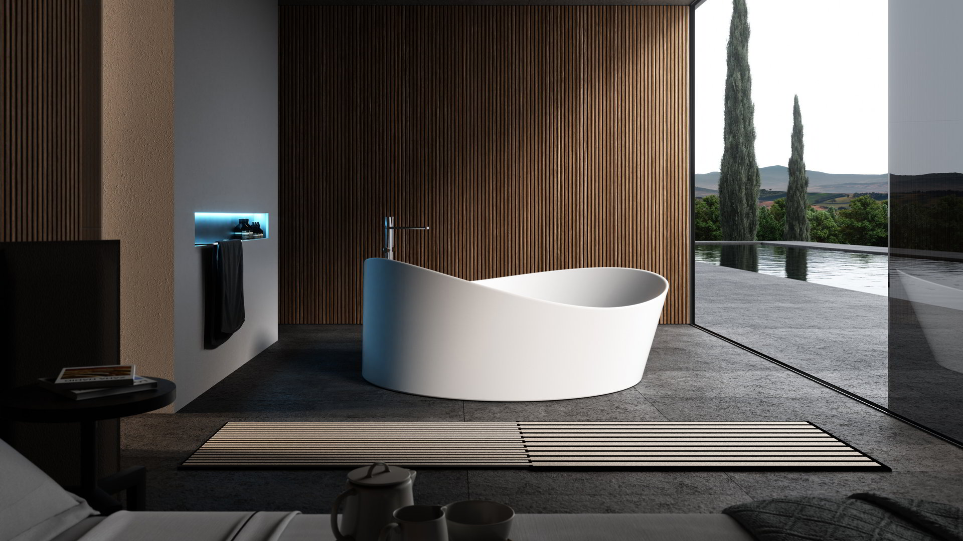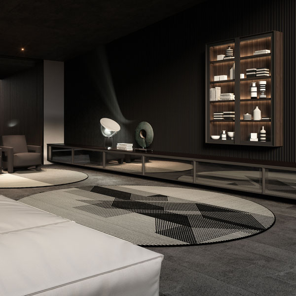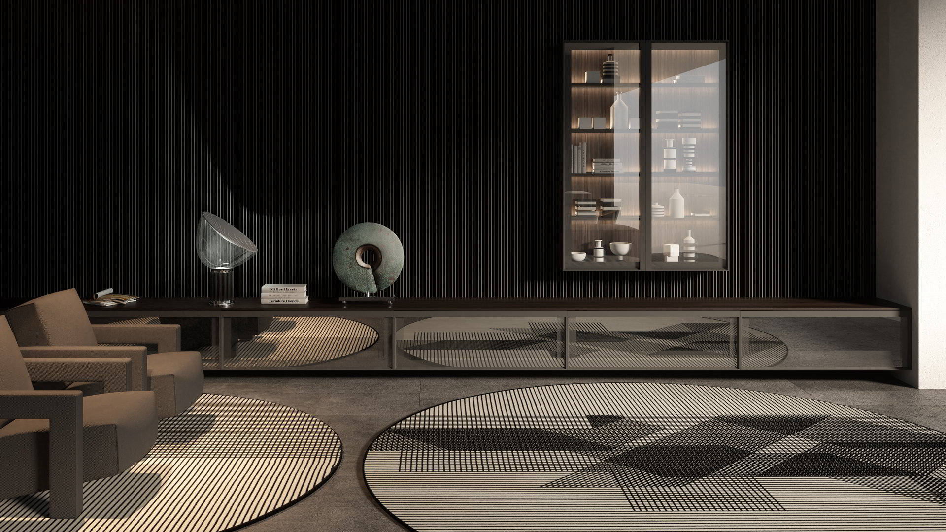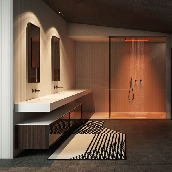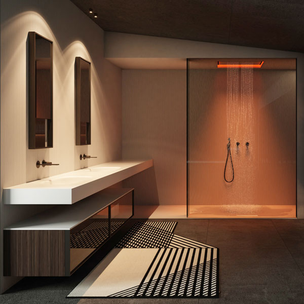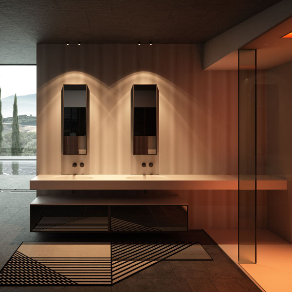 Great space is dedicated to the latest proposals signed by gumdesign. The 024 and Fonte washbasins are suitable for environments in which the wallpaper from the Tralerighe collection covers the vertical walls, defining a homogeneous and coordinated image in shades of black and white. There are integrated and functional compartments for storing everyday objects integrated in the walls; Dimezzo and Framezzo by AL Studio, precious accessories that allow you to free up space and take advantage of every inch of the environment with rigor and precision. Without forgetting to mention the carpets, also from the Tramato collection, which complete the furnishings of the different rooms together with bathroom fixtures, sinks integrated into the tops, floor lamps and accessories such as the new Specchi di Carta (mirrors) also from gumdesign.