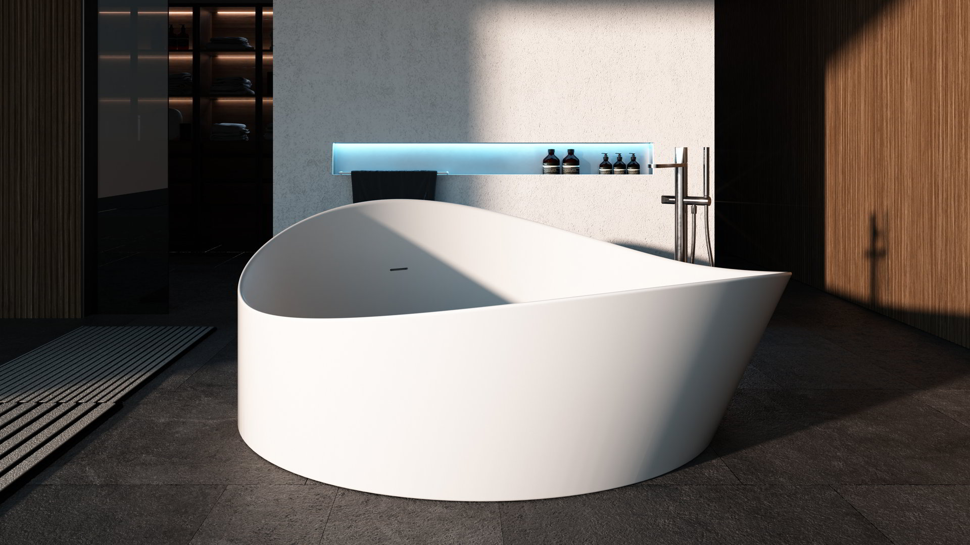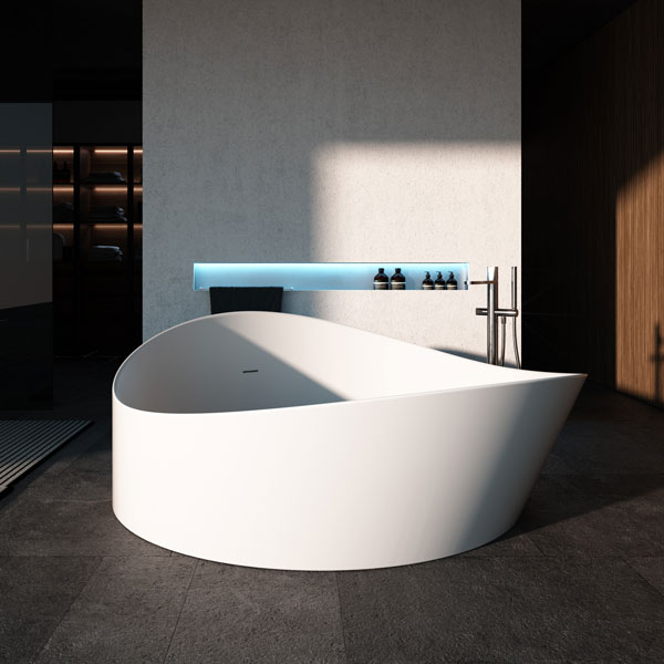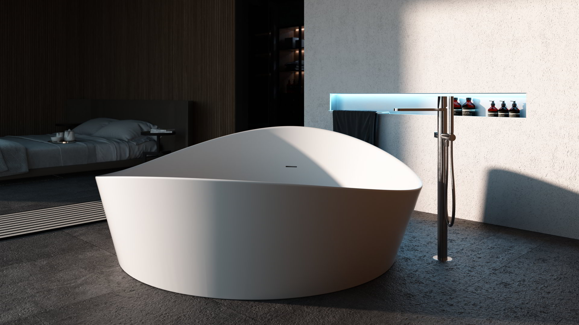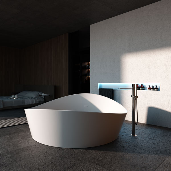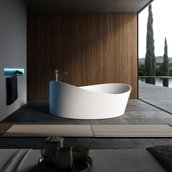 Great space is dedicated to the latest proposals signed by gumdesign. The 024 and Fonte washbasins are suitable for environments in which the wallpaper from the Tralerighe collection covers the vertical walls, defining a homogeneous and coordinated image in shades of black and white. There are integrated and functional compartments for storing everyday objects integrated in the walls; Dimezzo and Framezzo by AL Studio, precious accessories that allow you to free up space and take advantage of every inch of the environment with rigor and precision. Without forgetting to mention the carpets, also from the Tramato collection, which complete the furnishings of the different rooms together with bathroom fixtures, sinks integrated into the tops, floor lamps and accessories such as the new Specchi di Carta (mirrors) also from gumdesign.