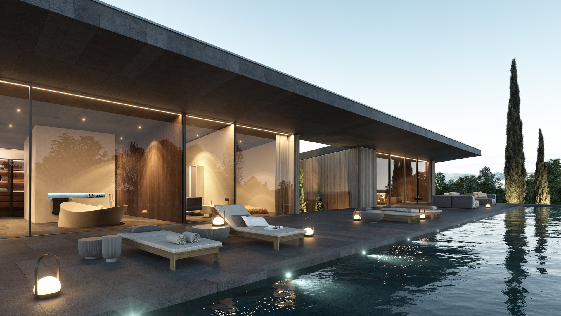 A contemporary architecture immersed in the unique panorama of the Etna valley, a villa with large and generous spaces in which the boundary between inside and outside is canceled by the large glass openings, a project that makes the perfection of details its distinctive feature. Amongst materials of excellence, refined finishes and sophisticated furnishings, the antoniolupi collections stand out. Artifice over nature, between contemporary and tradition, between essential and minimal design and refined materials a single-family villa designed by Arch. Antonio Iraci rises on the slopes of the Etna. Linear in its geometric and volumetric perfection, the residence develops lengthwise and fits into the surrounding landscape in a discreet way due to its low height despite the development on three levels. One level is underground with the use of natural materials and large surface stained glass windows.